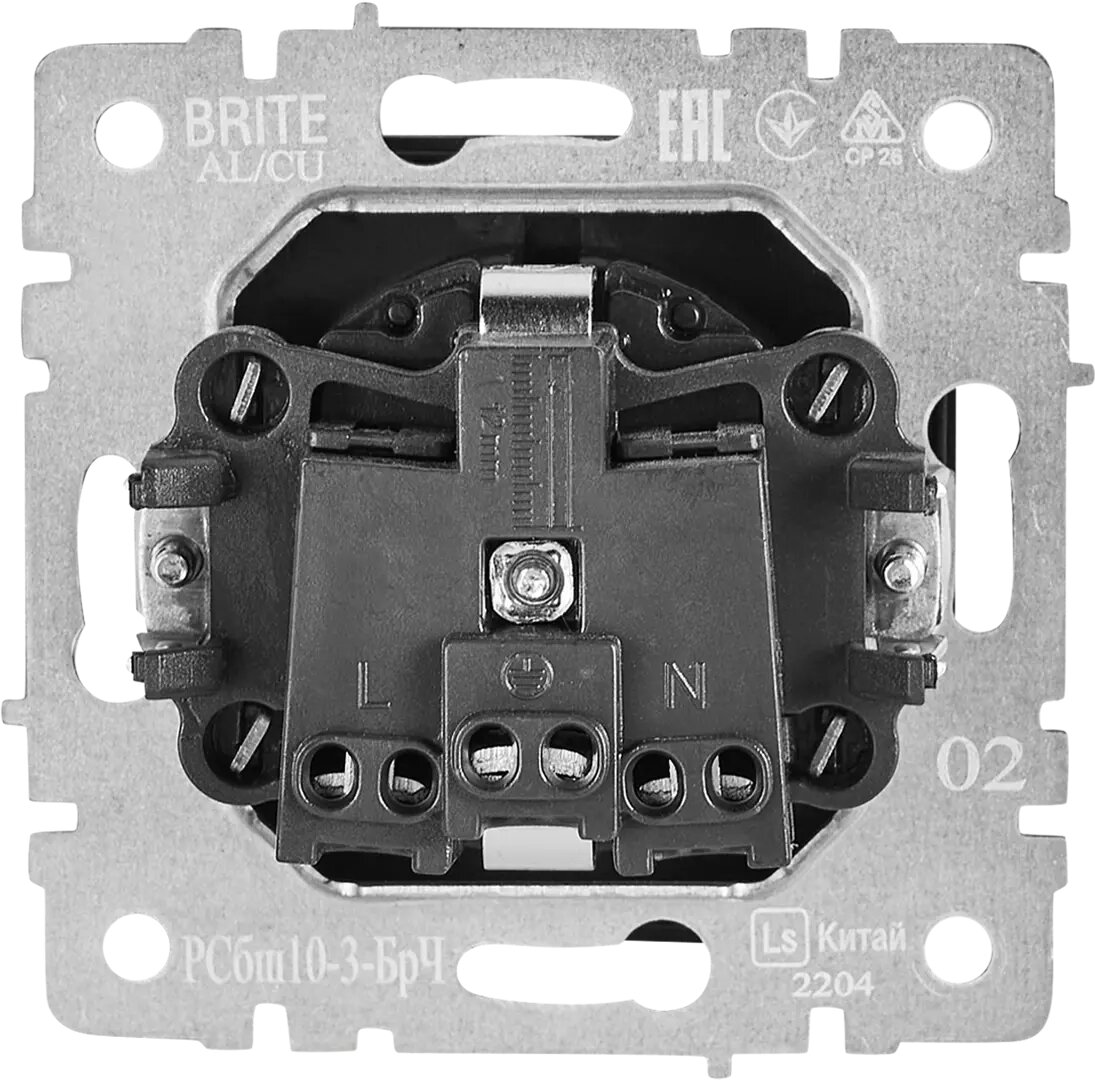 **Розетка IEK Brite IEK РСбш10-3-БрС** — встраиваемая модель оснащена заземлением, защитными шторками и крышкой. Изготовлена из прочного пластика, не поддерживающего горение. Предназначена для установки в стены и панели.