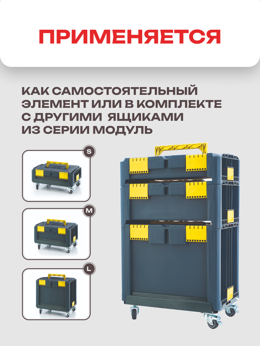 **Ящик для инструментов Zagler Модуль S** может использоваться как самостоятельная емкость или один из элементов штабелируемой конструкции. Корпус модели выполнен из полипропилена, оснащен плотно закрывающейся на замки крышкой и откидной ручкой.
