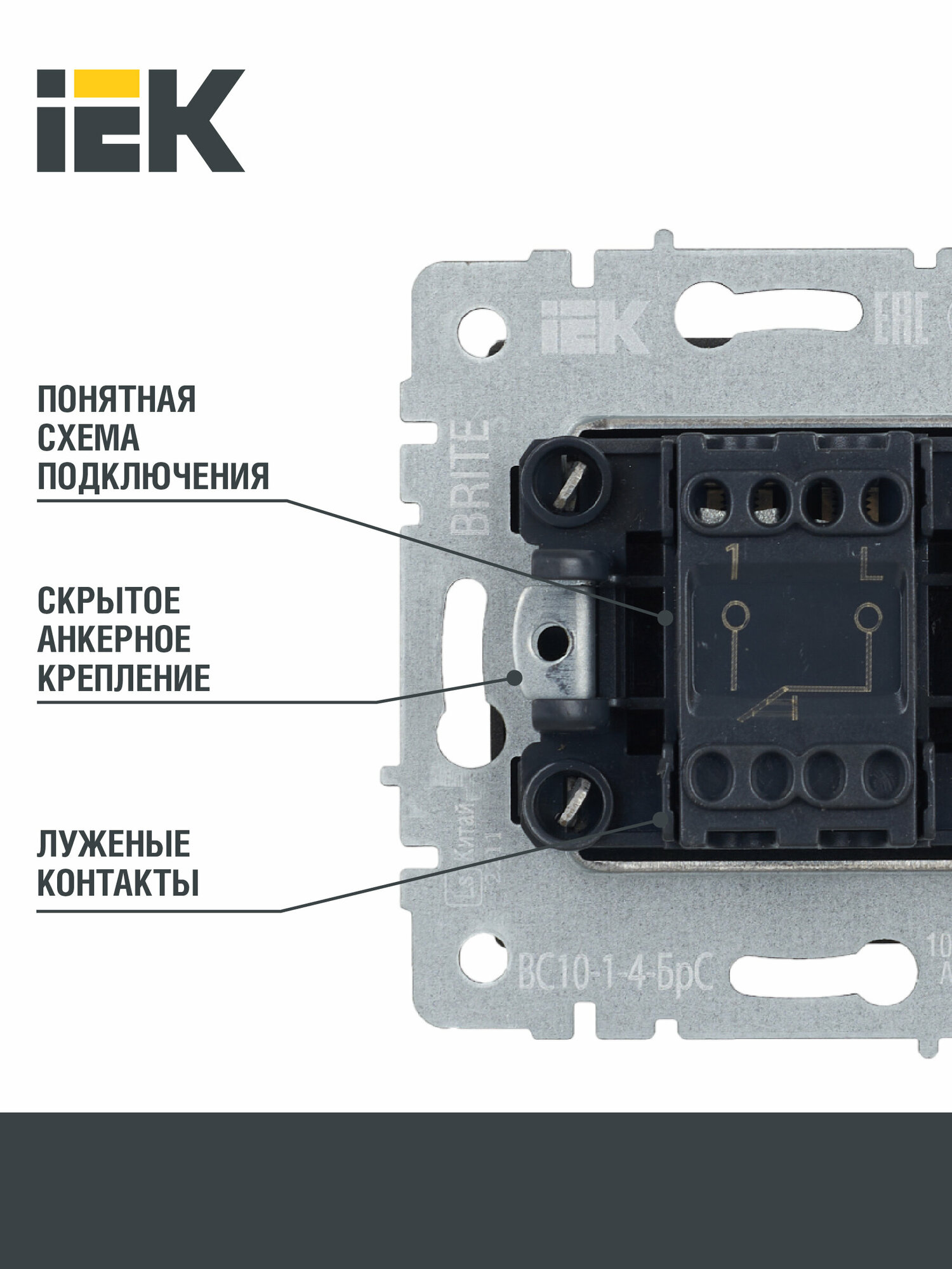 **Выключатель IEK Brite** предназначен для встраиваемого монтажа. Используется для управления одним источником освещения. Самовозвратный механизм обеспечивает дополнительную безопасность, автоматически отключая напряжение в электрической цепи при возникновении разного рода неисправностей или перегрузке. Лаконичный внешний вид и скрытый тип монтажа позволяют органично вписывать выключатель в современные интерьеры.