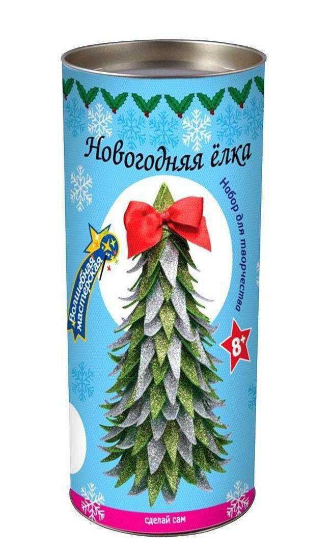 В этом наборе вы найдете материалы, из которых можно соорудить красивую елочку в технике "кинусайга". Эта техника во всем мире известна как пэйчворк без иглы. Вам действительно не придется сшивать элементы поделки - они крепятся специальными гвоздиками к пенопластовой основе. "Ветки" елочки изготавливаются из современного материала EVA, отличающегося высокой пластичностью и прочностью. Листы, из которых нужно вырезать элементы елочки, обсыпаны мерцающими блестками. Последний штрих при работе с набором - декорирование готовой елочки алой атласной лентой.