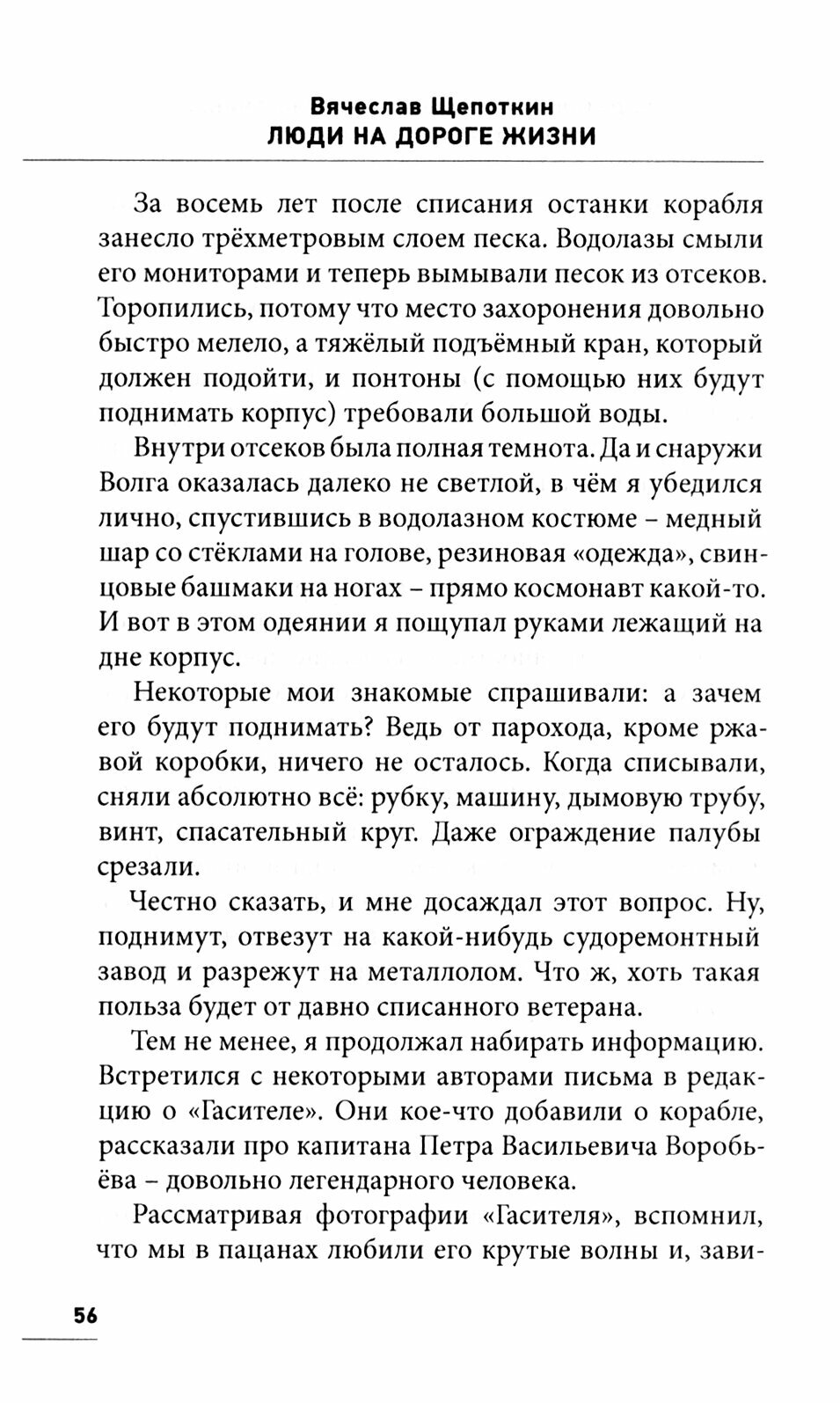 Говорят, неинтересных людей нет. В жизни какого-нибудь человека бывает такое, с чем многие хотели бы с удовольствием познакомиться. Особенно если жизнь и судьба тесно переплетены с судьбой страны. Как у журналиста и писателя Вячеслава Щепоткина. Ребёнком он увидел Сталинградскую битву и навсегда запомнил некоторые её драматические эпизоды. Ведь недаром говорят, что память ребёнка - это своего рода фотографический аппарат. Много лет спустя он обратился к этому сражению и, будучи корреспондентом "Волгоградской правды", развернул эпопею с подъёмом со дна Волги останков легендарного пожарного парохода "Гаситель", который был одним из участников Сталинградской битвы. Именно эти небольшие судёнышки, которые журналист назвал "малым флотом", в значительной мере помог ли выиграть поворотное сражение Великой Отечественной войны. Останки корабля не только подняли, но и, благодаря усилиям В. Щепоткина, восстановили и создали памятник "Гасителю", который по сей день стоит в Волгограде.