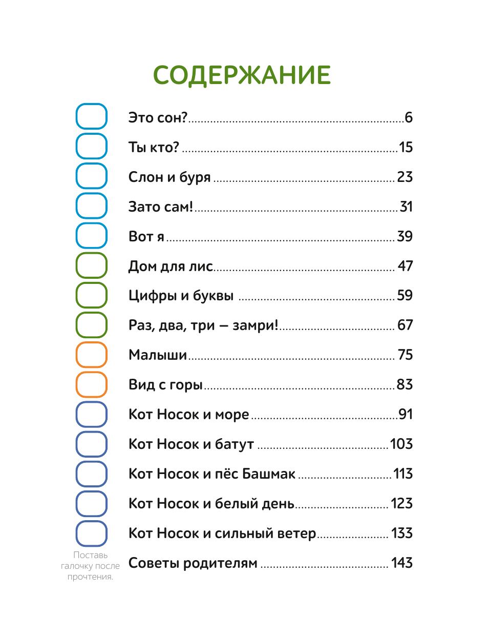 В сборник вошли рассказы: "Это сон?", "Ты кто?", "Слон и буря", "Зато сам!", "Вот я", "Дом для лис", "Цифры и буквы", "Раз, два, три - замри!", "Малыши", "Вид с горы", "Кот Носок и море", "Кот Носок и батут", "Кот Носок и пёс Башмак", "Кот Носок и белый день", "Кот Носок и сильный ветер".