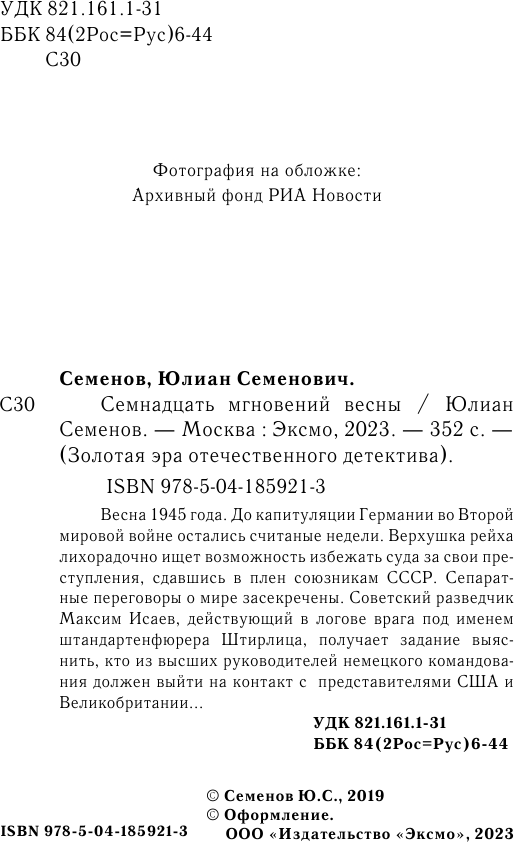 Семнадцать мгновений весны (Семенов Юлиан Семенович); ООО "Издательство "Эксмо", 2023