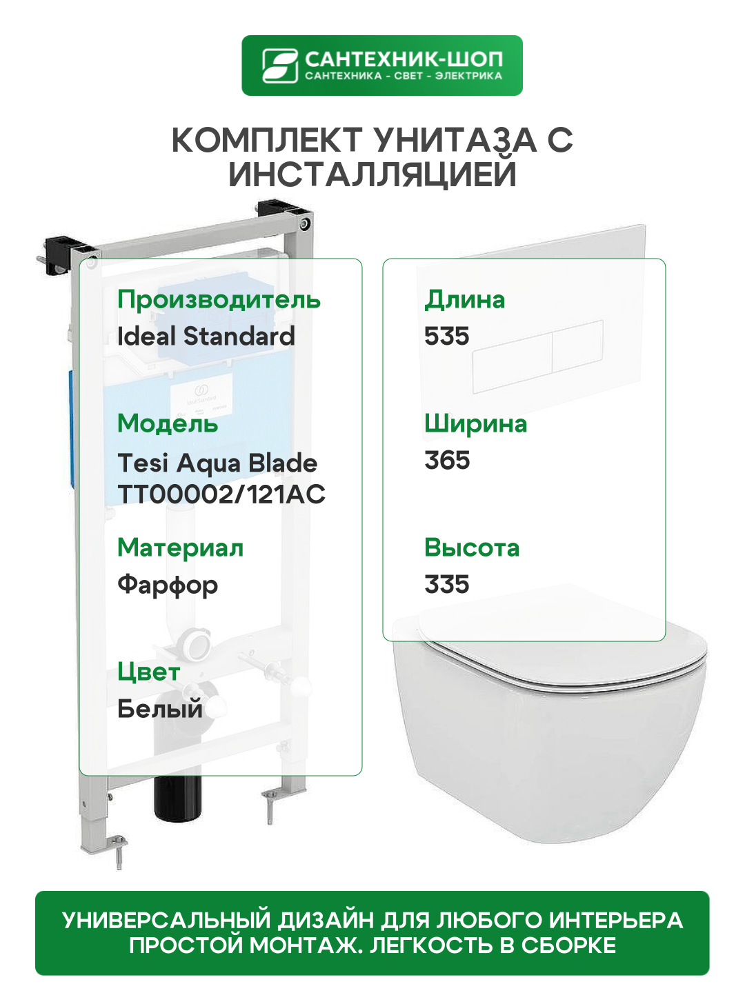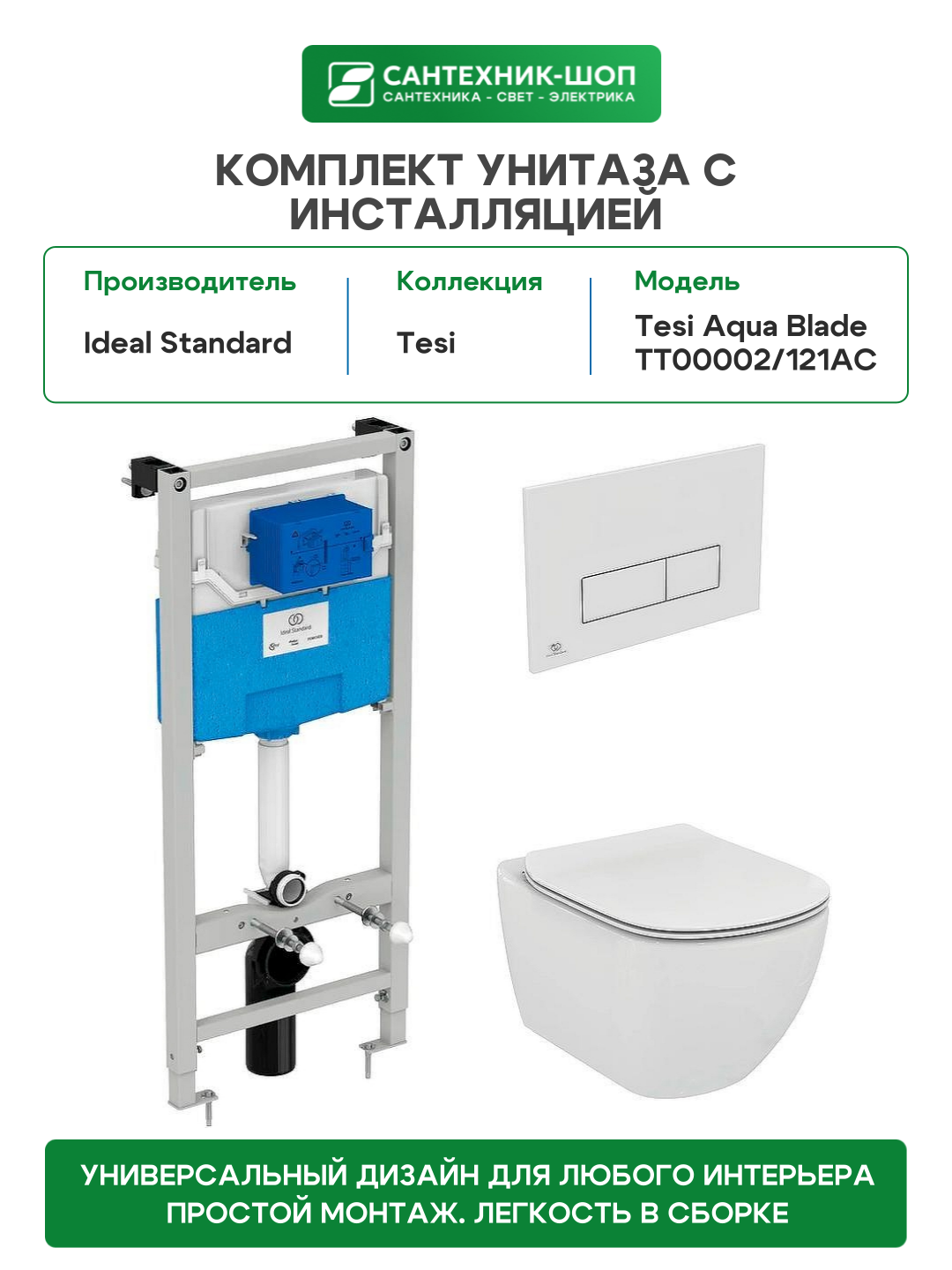 Комплект унитаза с инсталляцией Ideal Standard Tesi Aqua Blade TT00002/121AC с сиденьем Микролифт и Белой клавишей смыва.