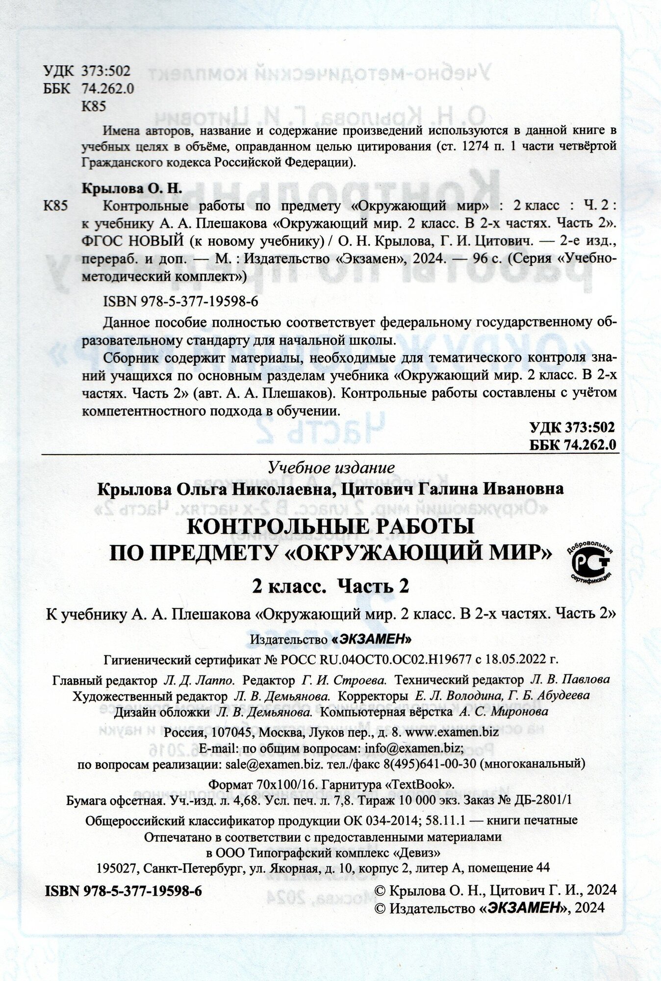 Окружающий мир. 2 класс. Контрольные работы к учебнику А. А. Плешакова. В 2-х частях. Часть 2. ФГОС (Крылова Ольга Николаевна, Цитович Галина Ивановна); Экзамен, 2024
