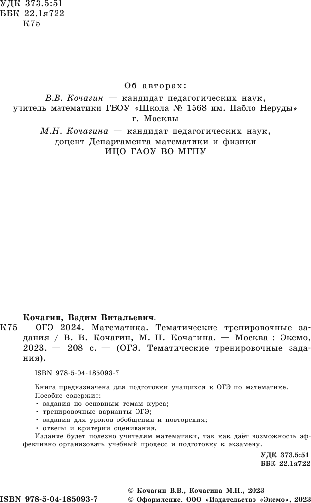 ОГЭ-2024. Математика. Тематические тренировочные задания (Кочагин Вадим Витальевич, Кочагина Мария Николаевна); Эксмо-Пресс, 2023