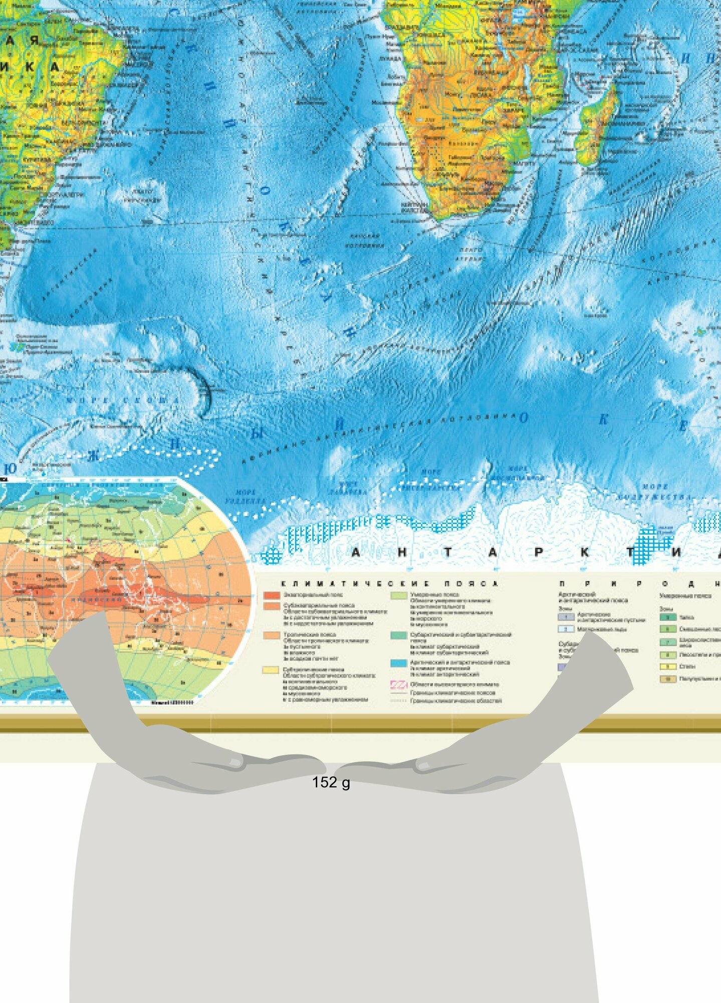 Настенная "Физическая карта мира" масштаба 1:32 000 000 (в 1 см 320 км) имеет размеры 1170х790 мм. Благодаря удачно подобранной цветовой шкале высот и глубин с множеством градаций на карте наглядно показан рельеф суши Земли и дна Мирового океана. Подробно отражена гидрологическая сеть материков. Приведены названия всех основных морфоструктурных форм земной поверхности (горных систем и хребтов, равнин, низменностей и пр.). Хорошо различимыми пунсонами показаны населённые пункты с градациями "более 1 млн жителей", "от 100 тыс. до 1 млн жителей" и "менее 100 тыс. жителей". Основная карта дополнена врезками на Арктику и Антарктиду, а также картами "Климатические пояса" и "Природные зоны суши". Карта упакована в прозрачный тубус (пакет из мягкого пластика с объёмным дном и еврослотом). Длина тубуса 80 см, диаметр 5 см. Рекомендовано для широкого круга пользователей.