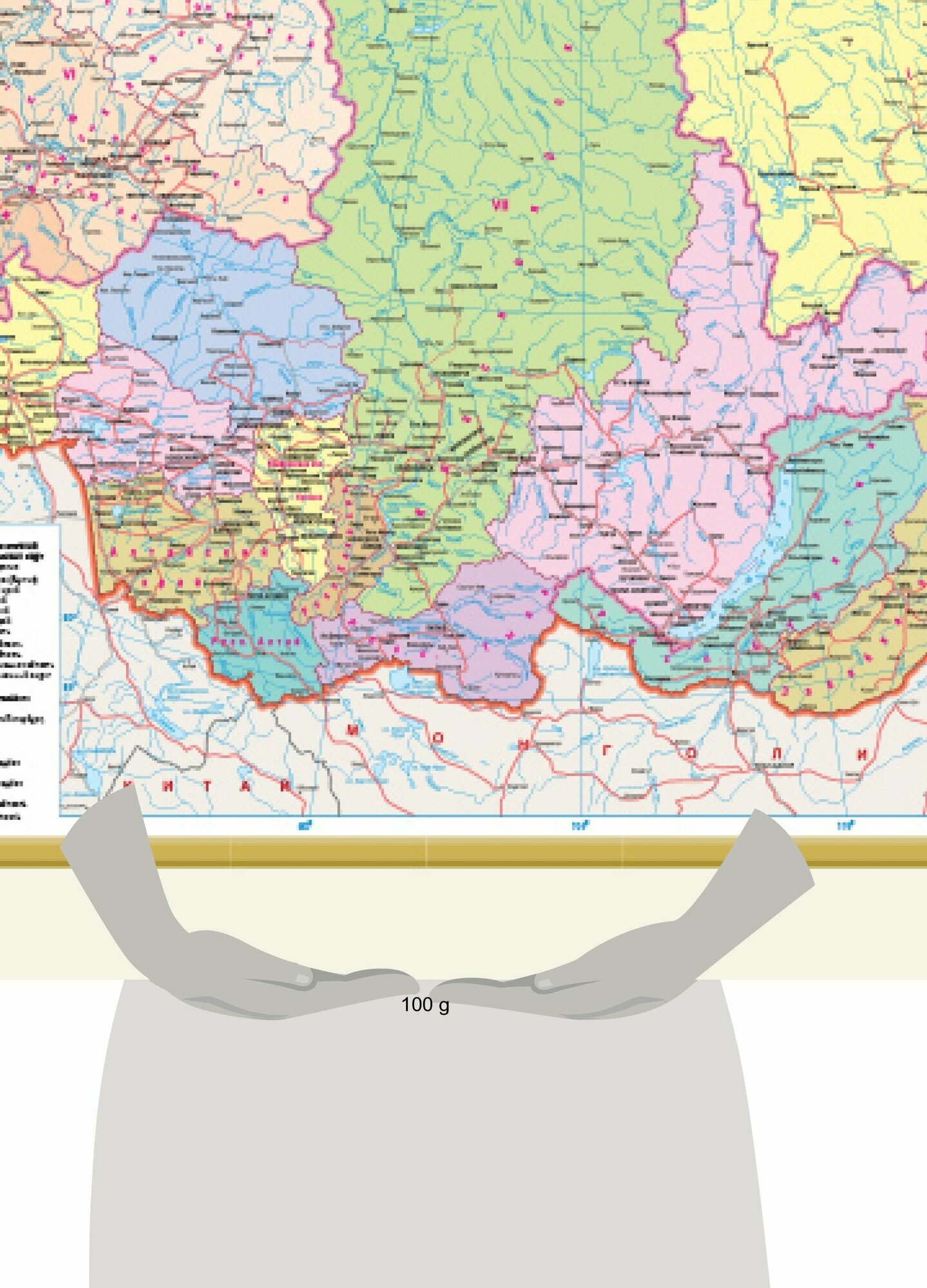 Карта формата А0 имеет размеры 1170х790 мм. На одной стороне листа - Физическая карта России (в новых границах) масштаба 1:7 000 000 (в 1 см 70 км). На ней в подробностях представлено всё многообразие современного рельефа нашей страны. Различия в абсолютных отметках территории (от -27 м на Прикаспийской низменности до 5642 м в горах Северного Кавказа) наглядно показаны при помощи цветовой шкалы высот и глубин. Приведены названия всех основных форм рельефа (горных систем и хребтов, равнин, низменностей, возвышенностей и пр.), выраженных в масштабе карты. Достаточно полно отражены на карте водные объекты суши – реки, озёра, водохранилища, болота, ледники. На другой стороне листа – карта "Федеративное устройство России" в масштабе 1:7 000 000. На карте представлены 89 субъектов Федерации, включая Запорожскую и Херсонскую области, Донецкуюи Луганскую народные республики, Республику Крым и Севастополь, с их столицами и центрами. Субъекты РФ сгруппированы по 8 федеральным округам. Численность населения городов и посёлков дана по 6 градациям. Показаны магистральные пути железнодорожного и автомобильного сообщения. Карта является прекрасным пособием при изучении географии России.