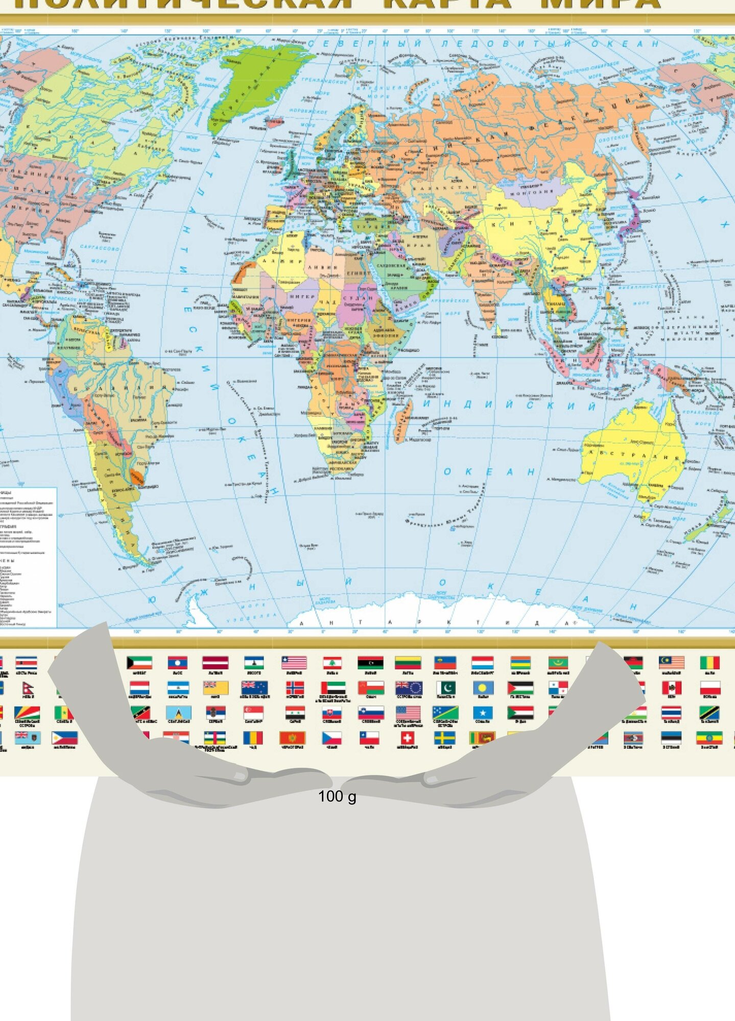 Двухсторонняя покрытая полимерной плёнкой карта имеет размеры 870 мм х 580 мм. На одной её стороне - Политическая карта мира в масштабе 1:44 000 000 (в 1 см 440 км), на другой – карта "Федеративное устройство России" масштаба 1:12 000 000 (в 1 см 120 км). На Политической карте представлены все 196 независимых государств мира с их столицами, а также владения и территории с особым статусом. Населённые пункты на карте даны в трёх градациях численности: более 1 млн жителей, от 100 тыс. до 1 млн, менее 100 тыс. жителей. Карта обрамлена официальными флагами государств мира, расположенными в алфавитном порядке, что облегчает их поиск. На карте "Федеративное устройство России" представлены все 89 субъектов Федерации с их столицами и центрами. Субъекты РФ сгруппированы по 8 федеральным округам. Красочным обрамлением карты являются флаги и гербы республик, краёв, областей, автономных образований и городов – субъектов Российской Федерации. На обеих картах Россия представлена в новых границах: с Донецкой и Луганской Народными республиками, Запорожской и Херсонской областями, Республикой Крым и Севастополем. Карта упакована в прозрачный тубус (пакет с объёмным дном и еврослотом) из мягкого пластика. Размеры тубуса: длина 590 мм, диаметр 50 мм. Рекомендовано для широкого круга пользователей.