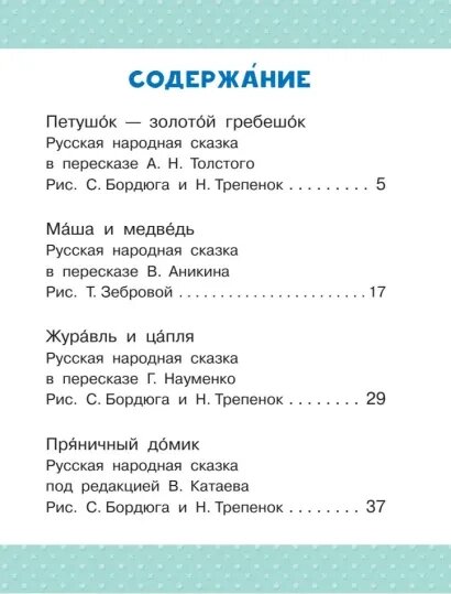 В книгу вошли четыре русские народные сказки в классических пересказах: "Петушок - золотой гребешок", "Маша и медведь", "Журавль и цапля", "Пряничный домик". Эти сказки как нельзя лучше подходят для первого чтения, ведь они хорошо известны ребёнку с ранних лет.