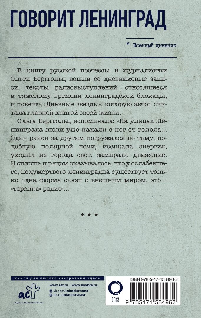 В книгу русской поэтессы и журналистки Ольги Берггольц вошли ее дневниковые записи, тексты радио-выступлений, относящиеся к тяжелому времени ленинградской блокады, и повесть «Дневные звезды», которую автор считала главной книгой своей жизни.