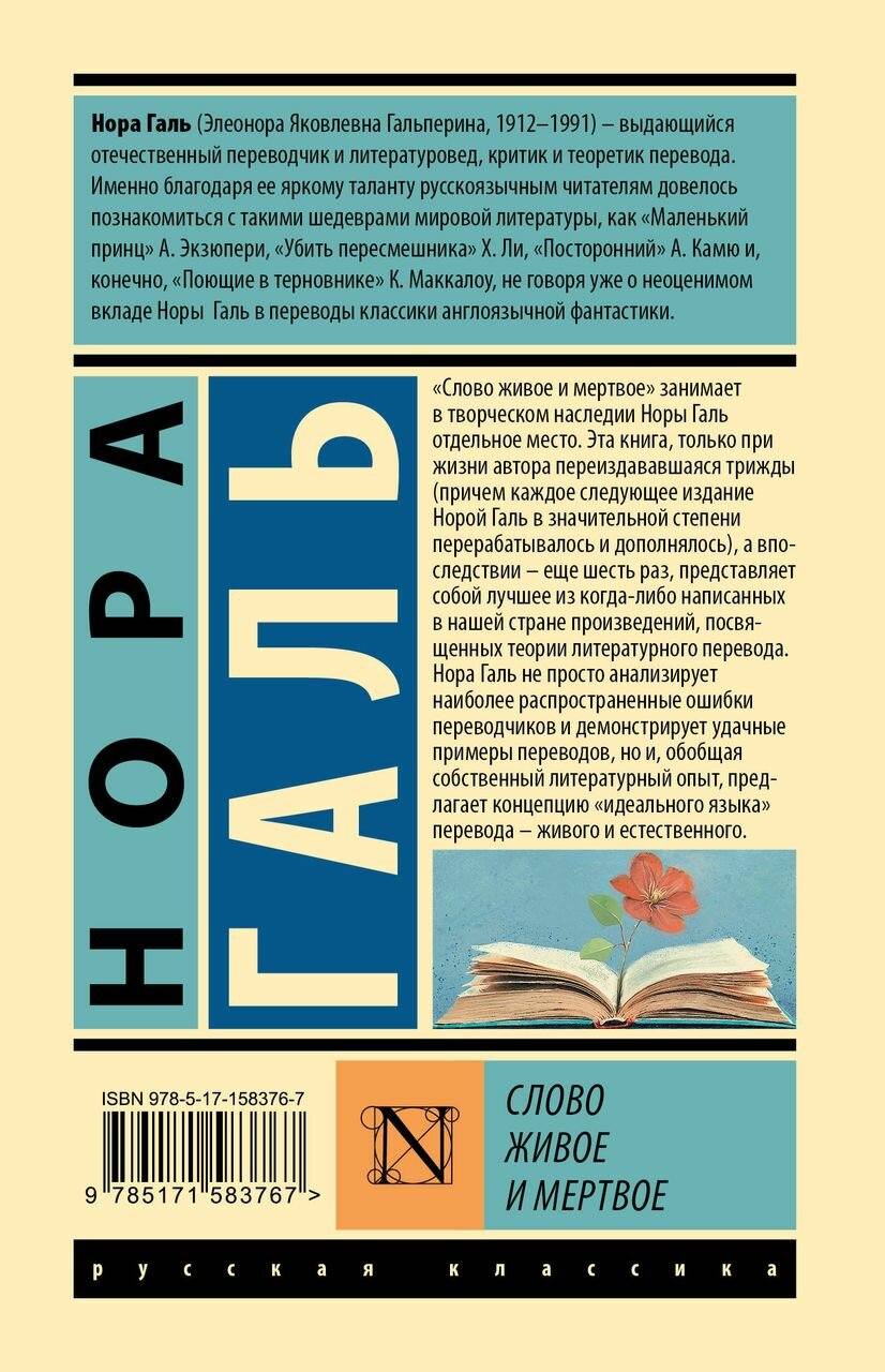 "Слово живое и мертвое" занимает в творческом наследии Норы Галь отдельное место. Эта книга, только при жизни автора переиздававшаяся трижды (причем каждое следующее издание Норой Галь в значительной степени перерабатывалось и дополнялось), а впоследствии – еще шесть раз, представляет собой лучшее из когда-либо написанных в нашей стране произведений, посвященных теории литературного перевода.