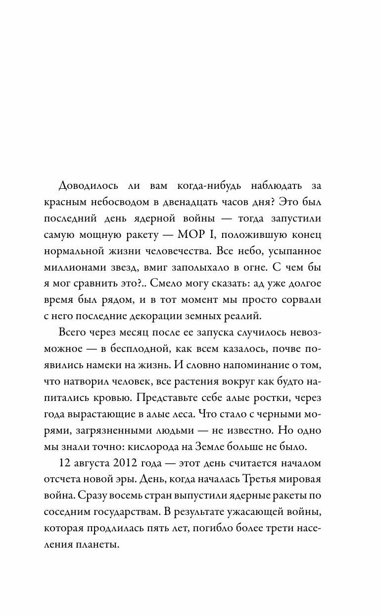 Честно очень заинтересовала аннотация с автором знакомилась впервые. Как антиутопия книга действительно слабовата, но возможно тут упор был больше на YA, но то как проработан сюжет мне не понравилось, очень много «воды» в тексте, полного описания окружающего мира, последствий катастрофы и как в них вписывается главная героиня я не получила, возможно ожидала большего. Но честно не зашла книга.