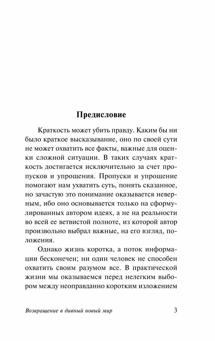 Книга Олдоса Хаксли "Возвращение в дивный новый мир" была впервые опубликована в далеком 1958 году, - и тем интереснее читается она в наши дни: ведь в этой работе великий английский писатель и философ, в своей полемичной манере, провел параллели между западной цивилизацией буржуазного "золотого века" 1950-х и антиутопическим тоталитарным "потребительским раем", описанным в его самом известном художественном произведении - романе "О дивный новый мир". Снова и снова Хаксли сравнивал вымышленный им много лет назад мир далекого будущего с миром вполне реальным, окружавшим его на момент написания "Возвращения" - и снова и снова находил приметы пугающего, опасного и все более явного сходства…