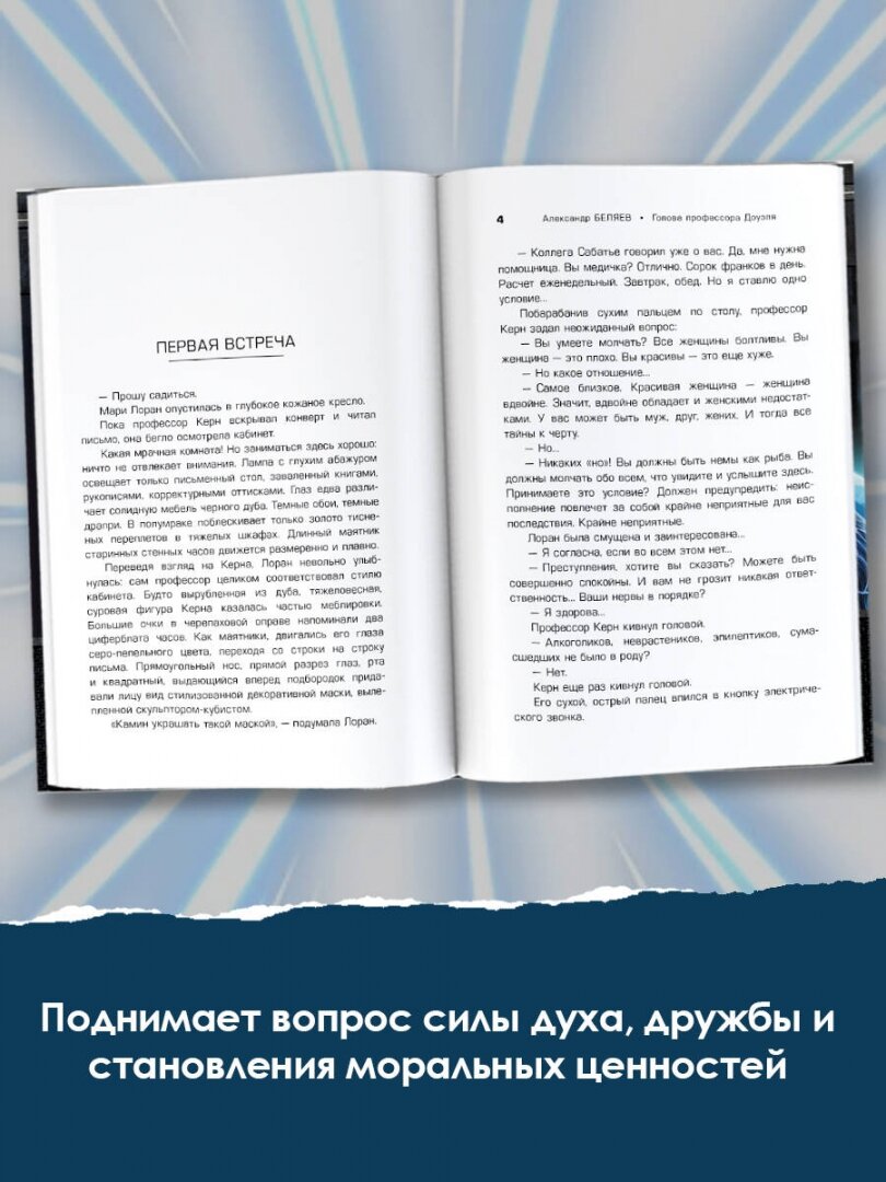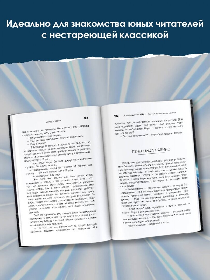 "Голова профессора Доуэля" -- не самая лёгкая книга для юных читателей, но, безусловно, одна из наиболее замечательных работ автора. А. Беляев писал её, основываясь на собственных ощущениях, испытанных во время болезни, когда он много месяцев не мог двигаться и жил исключительно "жизнью головы". Роман был переведён и издавался в более чем десяти странах.