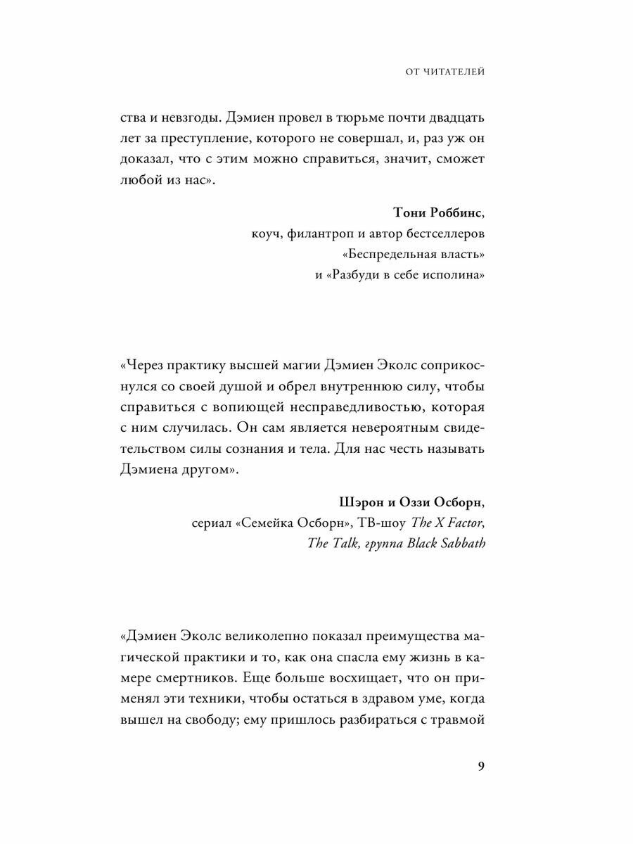 Первая дерзкая, смелая книга про реальную магию! Еще подростком Дэмиена Эколса приговорили к смерти за преступление, которого он не совершал. Ему удалось выйти на свободу спустя почти двадцать лет. Все эти годы он использовал магию как практику, которая меняет реальность благодаря намерению и силе воли, чтобы выдержать немыслимую боль, отчаяние и одиночество камеры смертников.
