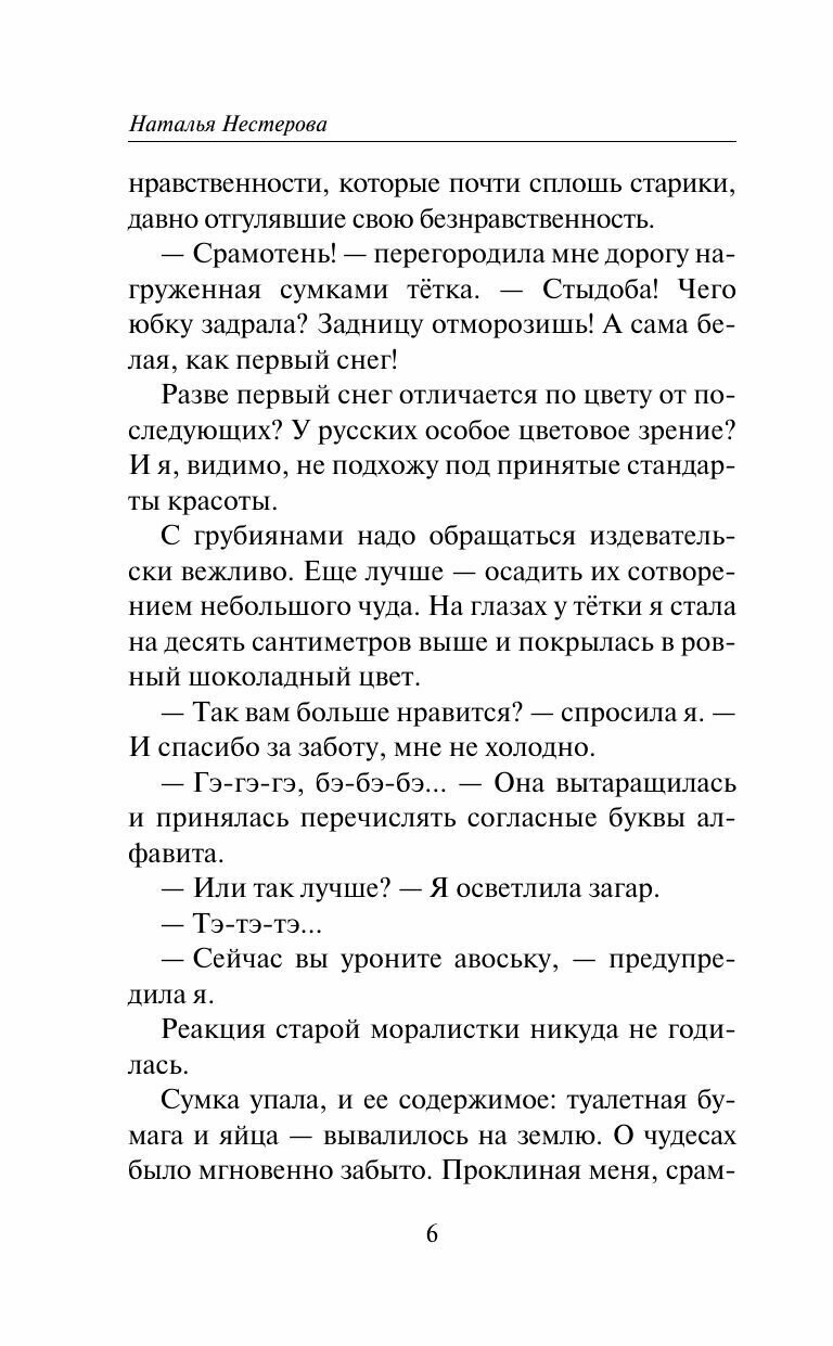 Просто обожаю замечательную Нестерову!!!! Покупаю все ее книги, начала читать в библиотеке и Наталья Владимировна вернула веру в то, что современные российские писатели могут писать интересно, увлекательно и очень легко, без заумных фраз и несогласованных предложений.