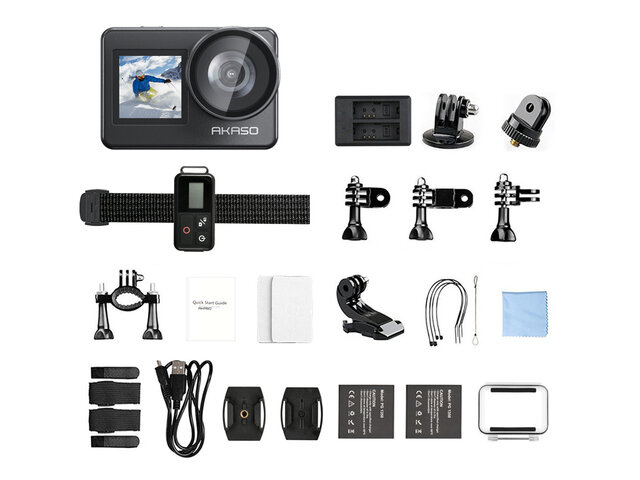 | Комплект поставки | 1x AKASO Brave 7 Action Camera, 1x Пульт управления, 2x 1350mAh Battery, 1x Рамка для камеры, 1x ЗУ для аккумуляторов, 1x Крепление для велосипеда, 7x различных креплений, 2x 2-х сторонняя клейкая лента, 2x Крепления на шлем, 1x Ремешок, 5x Стяжки, 1x USB-C кабель, 1x Тряпочка для протирки линзы, 1x Quick Reference Guide |