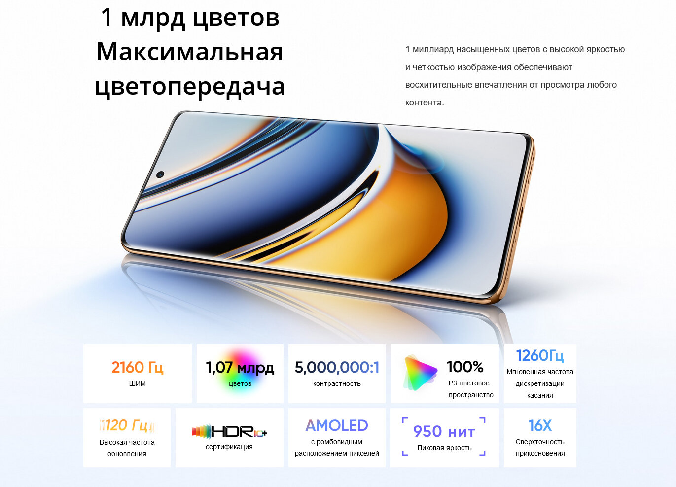 Realme 11 Pro - мощный средний класс смартфон, разработанный компанией Realme. Смартфон оснащен 6.7-дюймовым экраном AMOLED с разрешением 1080x2412 (FHD +), 120-герцевым обновлением частоты кадров, максимальной яркостью 950 cd / m? и контрастностью 5000000: 1, а также двумя краями дисплея и поддержкой HDR10 +. Также высококачественные стерео-динамики и Dolby Atmos предоставляют превосходный плавный звук. Корпус из поликарбоната обеспечивает полную защиту от вибрации, ударов и падений. Толщина составляет 8.2 мм, а вес - 183 г. Используемая поверхность составляет 90.1%. В рамках аппаратной части Realme 11 Pro оснащен процессором MediaTek Dimensity 7050 (6 нм), 8/12 Гб оперативной памяти и хранилищем данных на 256/512 Гб. При прохождении теста AnTuTu (v9) смартфон набрал 528313 баллов. Защита смартфона производится при помощи сканера отпечатков пальцев, а для охлаждения применяется производительная система. Фотовоспроизведение оснащено двойной камерой. Основная модуль оснащен 108 Мпсельской сенсором и быстрым объективом f/1.75, и также модулем макро на основе GalaxyCore GC02M1 с разрешением 2 Мпикс и объективом f/2.4. Для селфи-фото применяется датчик Samsung S5K3P9 с 16 Мпикс и объективом f/2.45. В нем также предусмотрена оптическая стабилизация (OIS) и запись видео в разрешении 4K. В отношении соединения доступен Bluetooth 5.2, Dual SIM, WiFi 6 (802.11ax), GPS (L1 + L5). Батарея этого смартфона имеет емкость 5000 мАч и быструю зарядку до 67 Вт.
