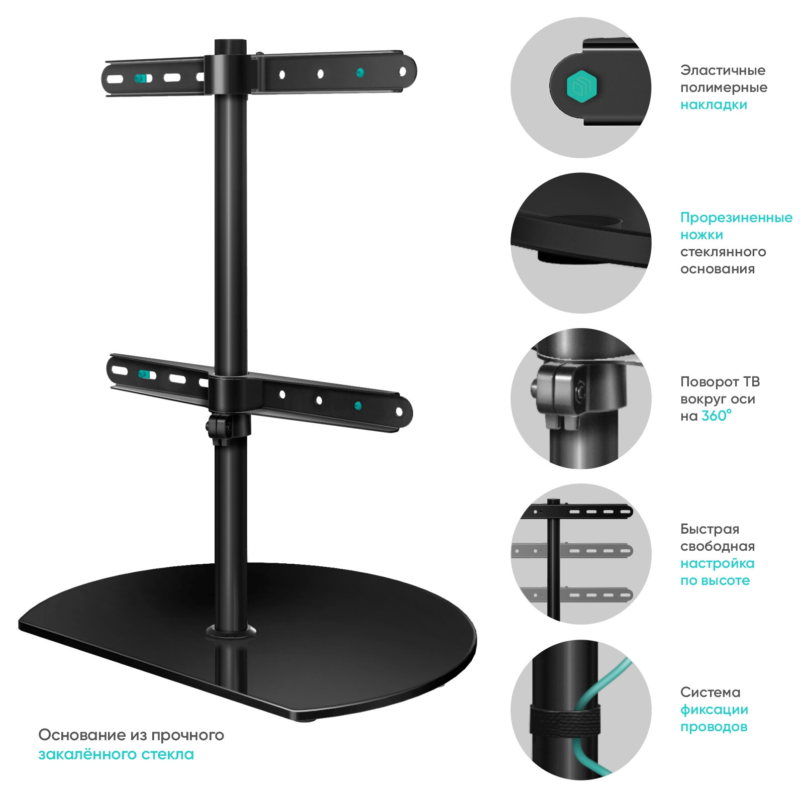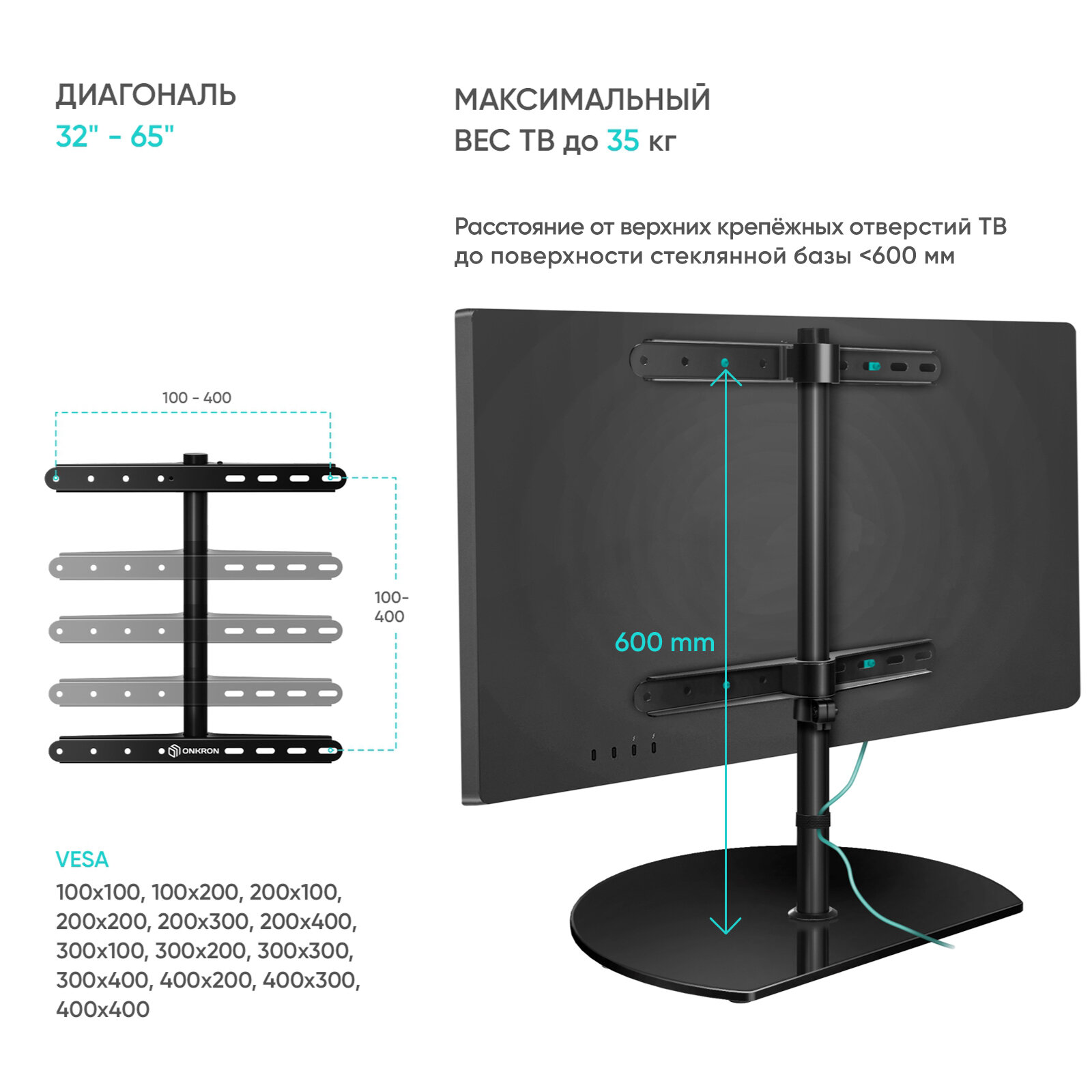 ONKRON PT2 - подставка (стойка) для телевизора настольная с кронштейном, со стальным основанием и полками из закаленного стекла для телевизора и LCD панелей с диагональю от 32’’ до 65’’ дюймов.Основные преимущества:Поворот ТВ вокруг оси на 360?. Стойка предусматривает поворот вправо и влево на 180 градусов.Быстрая регулировка по высоте. Положение телевизора свободно регулируется по всей высоте столба (625 мм) с помощью винта на оборотной части колонны.Тонкая, надежная, элегантная стойка (подставка) будет незаметным и органичным дополнением к вашему телевизору.Накладки из силикона предотвратят повреждение задней панели телевизора.Основание подставки для телевизора изготовлено из прочного закаленного стекла.Резиновые ножки стойки для телевизора сохранят мебель от повреждений и царапин.В комплекте к настольной стойке для телевизора входит полный набор для монтажа (ключи, винты, инструкция).Гарантия на подставку для телевизора 5 лет.Модель стойки для ТВ разработана в лаборатории ONKRON, прошла все необходимые испытания и изготовлена на собственном производствеМодель ONKRON PT2 поддерживает большинство из известных VESA-стандартов крепления: 100x100, 100x200, 200x100, 200x200, 200x300, 200x400, 300x100, 300x200, 300x300, 300x400, 400x200, 400x300, 400x400Премиальный дизайн. Конструкция из холоднокатаной стали и закаленного тонированного стекла выигрышно смотрится в любом интерьере.Защита от повреждений. Фирменные лазурные полимерные накладки снижают риск механического повреждения задней части телевизора о стальной кронштейн.Прорезиненные ножки стеклянного основания защитят вашу мебель от повреждений и царапин при передвижении подставки.Система фиксации проводов. Специальные держатели позволяют аккуратно закрепить провода вдоль трубы.Подставка для телевизора ONKRON PT2 подходит для большинства телевизоров популярных брендов, среди которых: Samsung, LG, Sony, KIVI, Tcl, Xiaomi Mi, SUPRA, Panasonic, Hyundai, Erisson, Asano, Horizont, JVC, Thomson, HARTENS, Sharp, Toshiba, Skyworth, BBK, AVEL, Витязь, Веко, BQ, DEXP, SkyLine, Pioneer, Rolsen, Harper, Hisense, Hitachi, Polarline, Prestigio, Telefunken и других.Модель PT2 образует вокруг себя зону комфортного просмотра. Конструктивные решения позволяют быстро и без усилий поднимать и опускать телевизор на необходимую высоту, а также вращать экран. Стойка PT2 предусматривает полный поворот вокруг оси (-180?…+180?) установленного на нее ТВ.Легко регулируйте высоту и угол обзора экрана, комфортно расположившись в любой точке комнаты.Приобретая модель ONKRON PT2, у Вас появляется возможность поставить телевизор на любую ровную плоскость. Это может быть не только стол, но и тумба, широкий подоконник, и даже – пол!Несомненные плюсы ONKRON PT2: современный лаконичный дизайн, качество конструкции и неприхотливость в эксплуатации.Интерьерные стойки для телевизоров ONKRON созданы для высокого стандарта качества жизни.