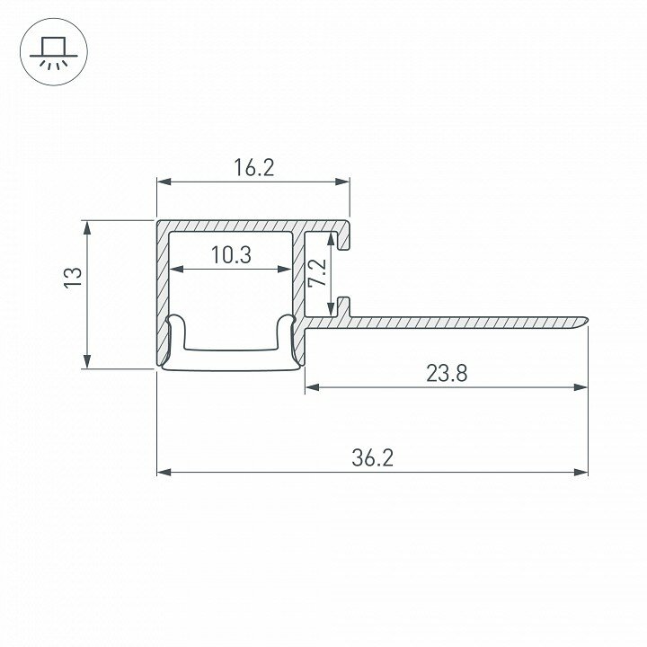 Алюминиевый встраиваемый профиль для светодиодных лент и линеек. Габаритные размеры (L×W×H): 2000х36,2х13 мм. Ширина площадки для ленты 10,3 мм. Экраны, заглушки и другие аксессуары приобретаются отдельно. Цена за 1 метр.