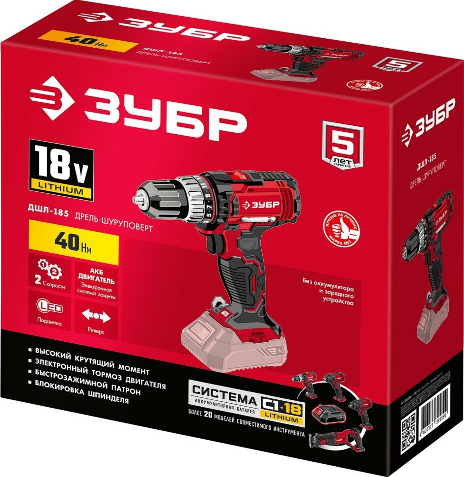 ЗУБР 18В, без АКБ, в коробке, дрель-шуруповерт. ДШЛ-185
