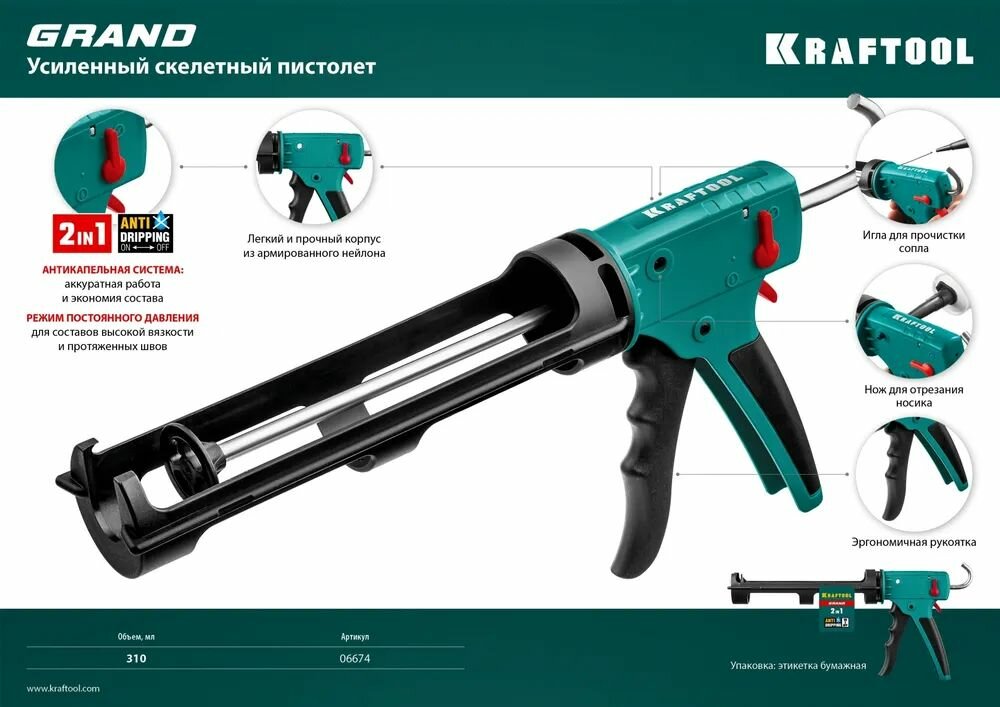 Сервис сравнения цен СкидкаГИД предлагает сравнить цены на товар «Пистолет для герметика Kraftool Grand 2-in-1 скелетный антикапля 310мл 6674»