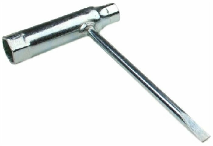 Ключ комбинированный Champion C1201/C240 подходит для бензопил 138, 242, 335, 341, 345, 255. Предназначен для монтажа свечей, шины в бензопиле, и нижняя часть используется для затяжки цепи. С одной стороны имеет размер 16 мм, с другой 11 мм.