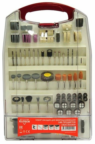 Набор оснастки (71 предмет) для гравировальных машин Elitech 1820.001300 включает в себя предметы для выполнения работ любой сложности. Содержит насадки разной формы и зернистости, предназначенные для резки, шлифовки и полировки древесины, металла, пластика и т.д. Поставляется в пластиковом кейсе!