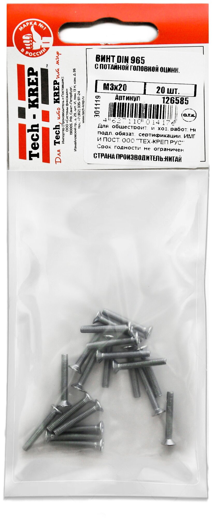 Винт DIN965 с потайной головкой оцинк. М3х20 (20 шт) - пакет Tech-Krep 126585