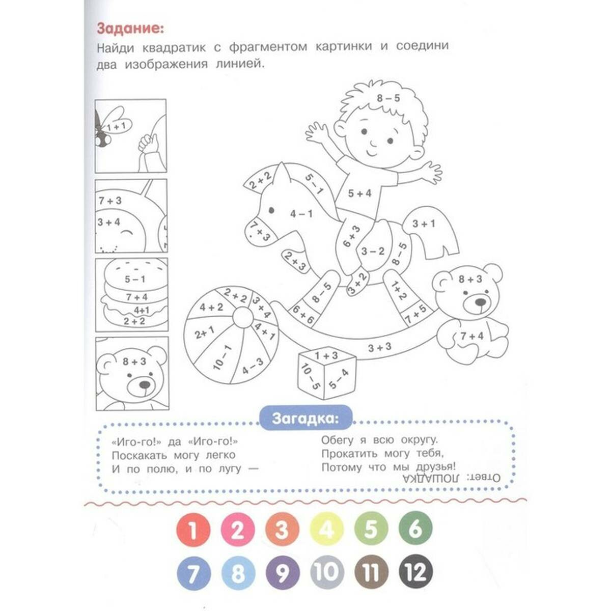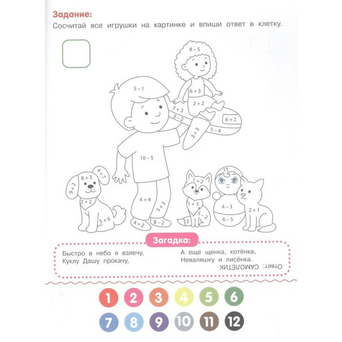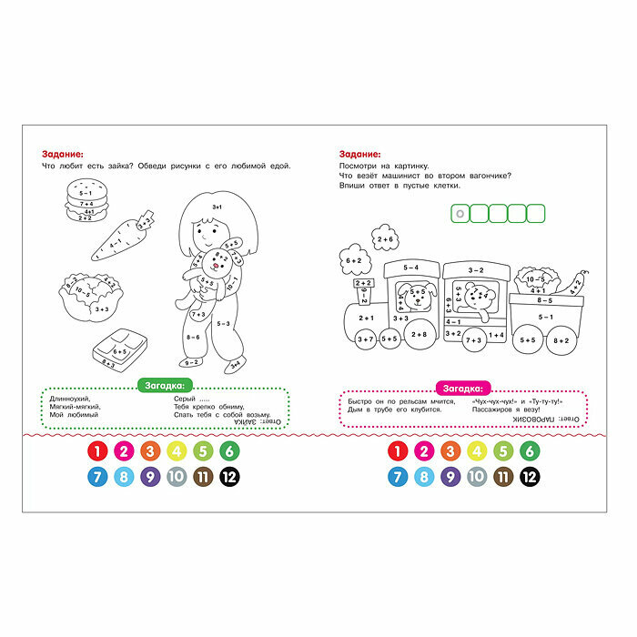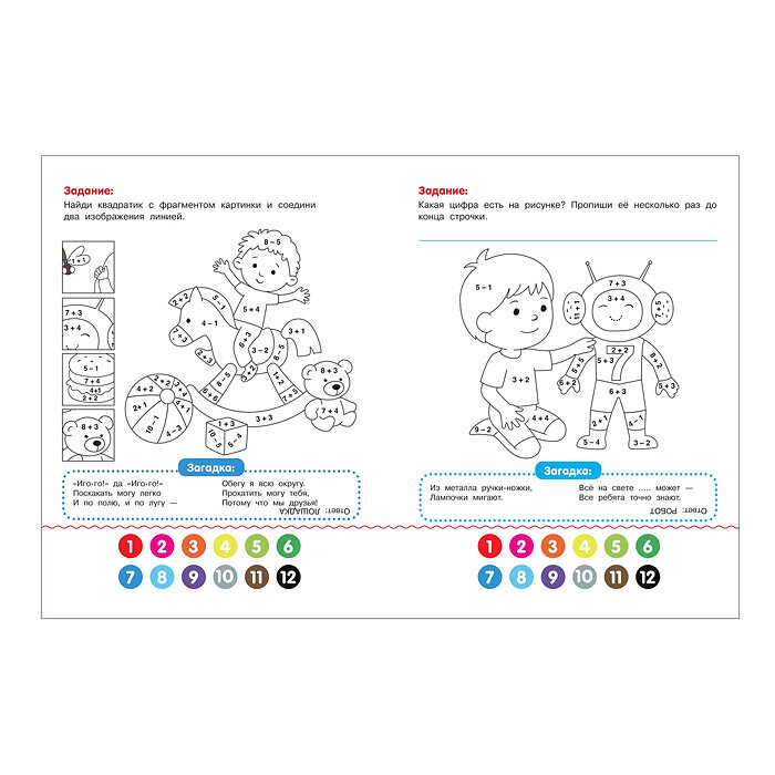 Умные раскраски с примерами помогут ребёнку весело и с пользой провести время, в игровой форме развивая у него внимание и память. Весёлые задания направлены на стимуляцию мелкой моторики и мышления, а также помогут закрепить начальные навыки счёта, чтения и письма. Решив простой пример, ребёнок запомнит цифры и цвета, а авторские загадки и стихи с договариванием на каждой странице, сопровождаемые ответами, прекрасно подойдут для первого самостоятельного чтения.