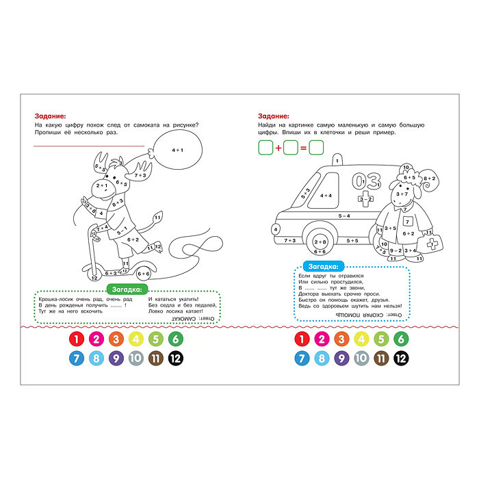 Умные раскраски с примерами помогут ребёнку весело и с пользой провести время, в игровой форме развивая у него внимание и память. Весёлые задания направлены на стимуляцию мелкой моторики и мышления, а также помогут закрепить начальные навыки счёта, чтения и письма. Решив простой пример, ребёнок запомнит цифры и цвета, а авторские загадки и стихи с договариванием на каждой странице, сопровождаемые ответами, прекрасно подойдут для первого самостоятельного чтения.