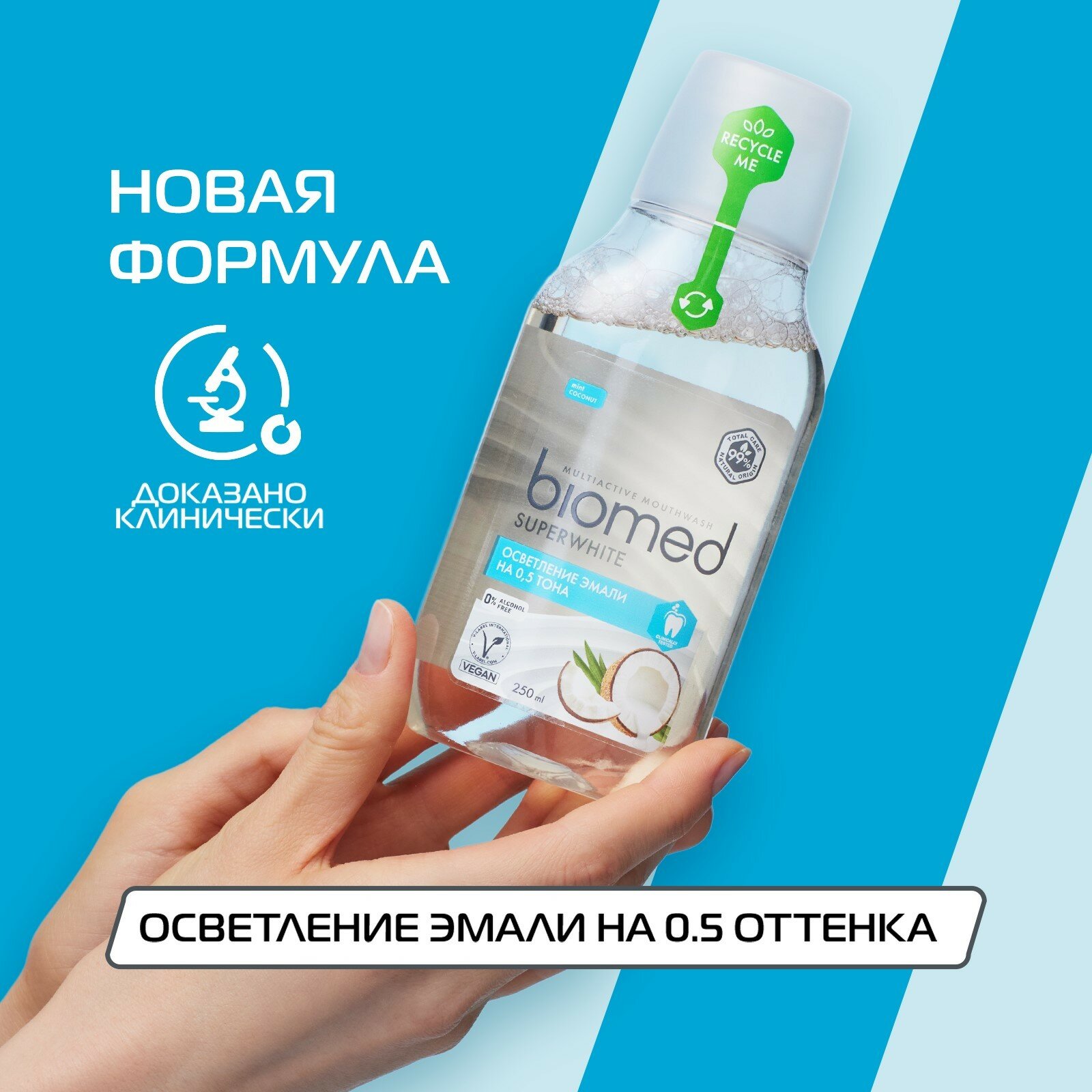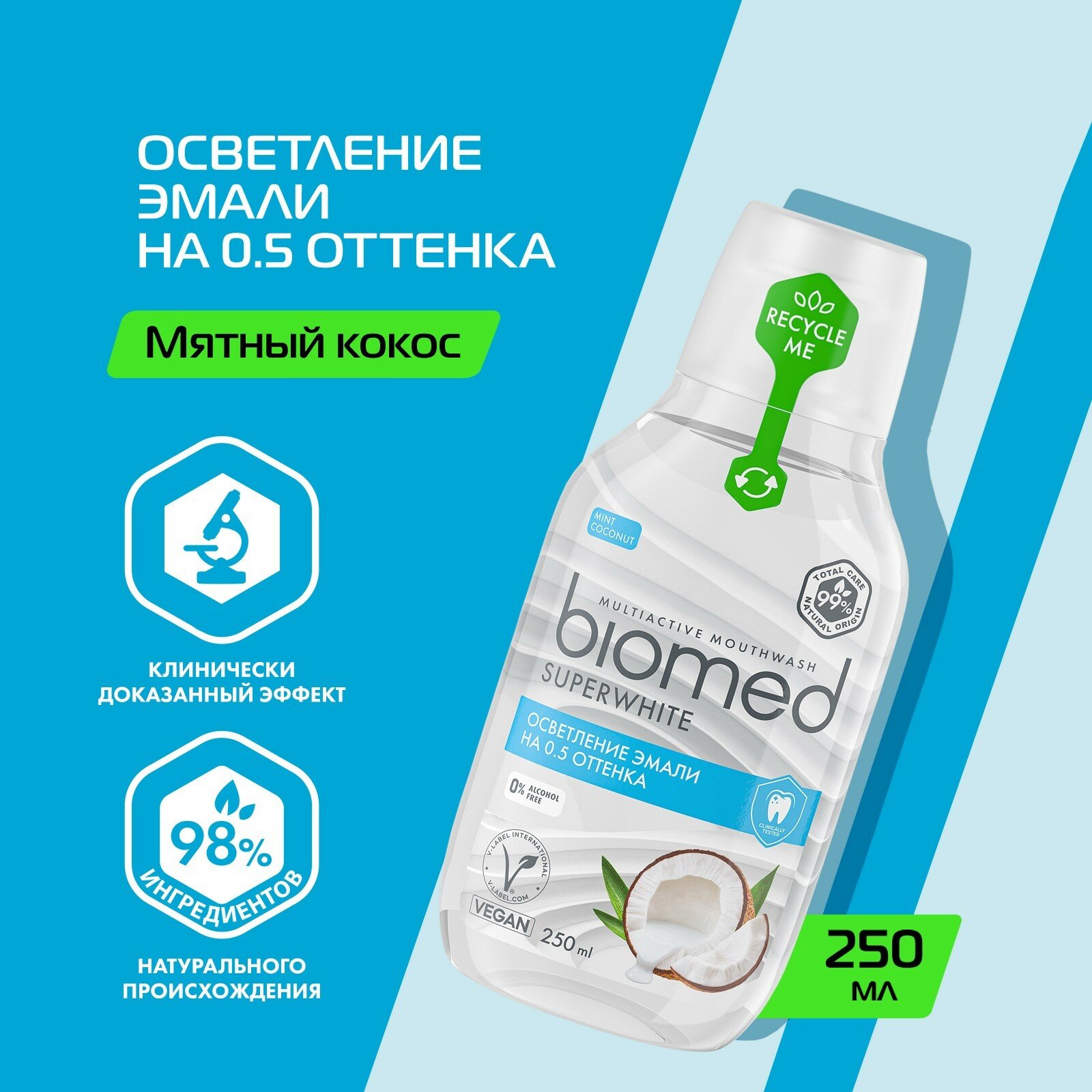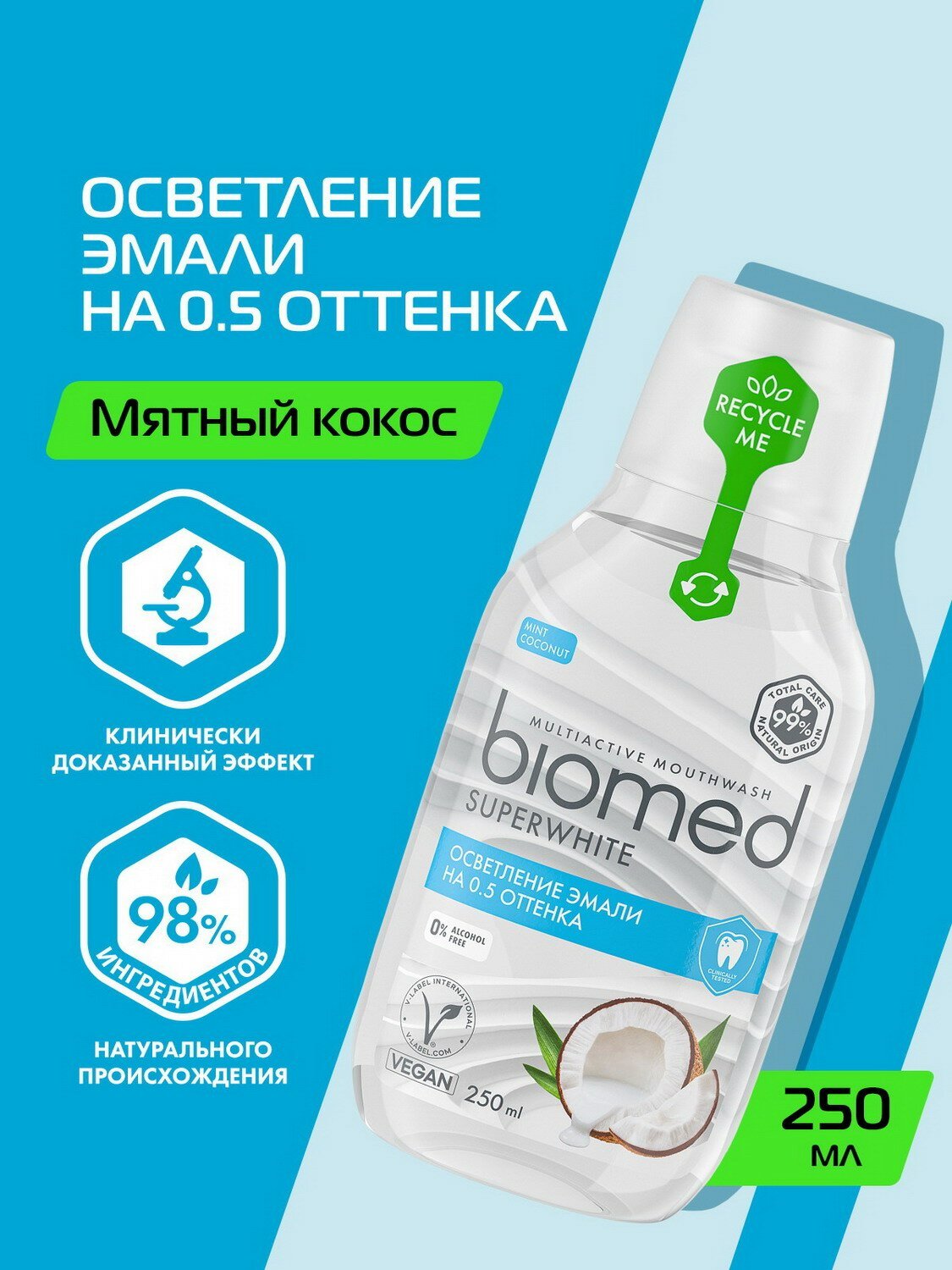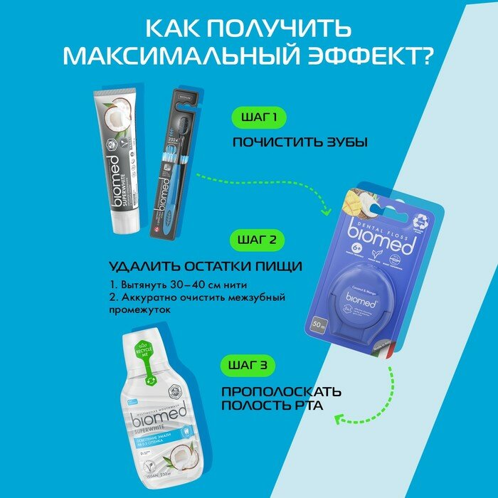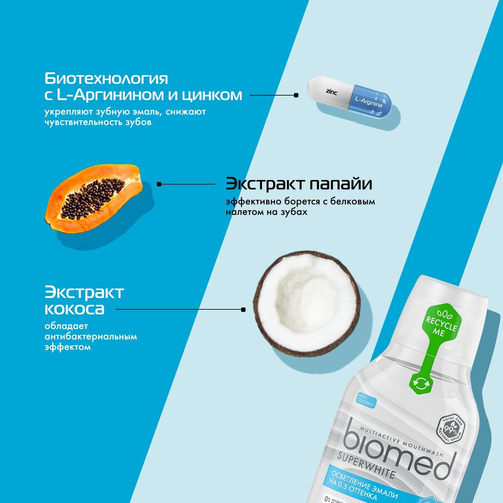 Натуральный комплексный ополаскиватель Biomed Superwhite с кокосовым вкусом и ароматом бережно осветляет эмаль, усиливает отбеливающие свойства зубной пасты. На 99% состоит из компонентов натурального происхождения. Ферментированный экстракт кокоса и фермент папаин растворяют налет. L-аргинин, цинк, медь и магний укрепляют эмаль, экстракты подорожника и листьев березы оказывают антикариесное и противовоспалительное действие.