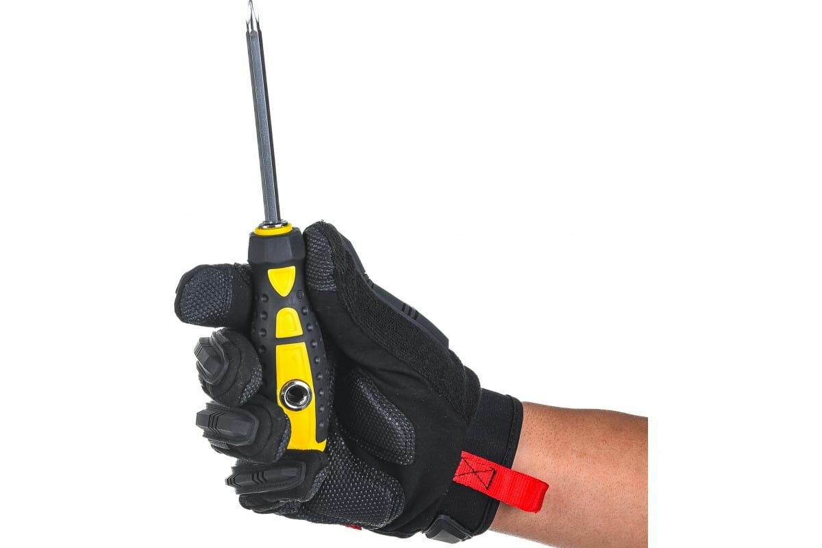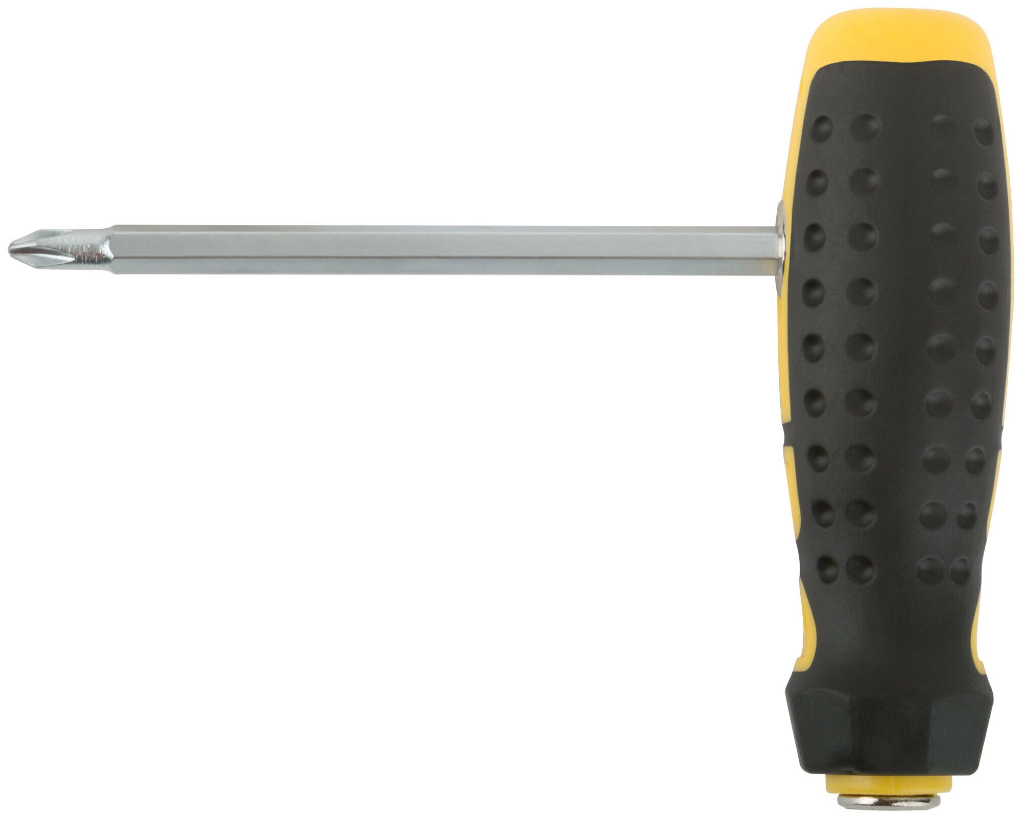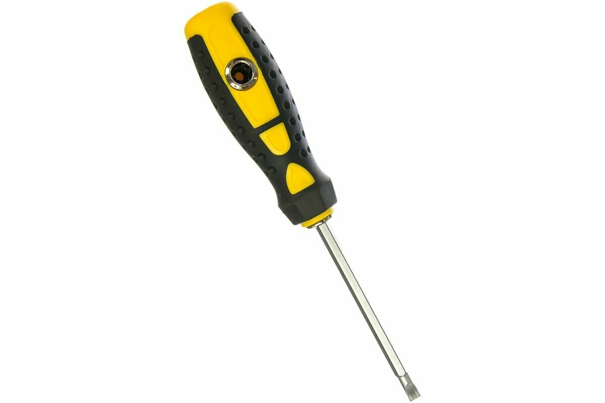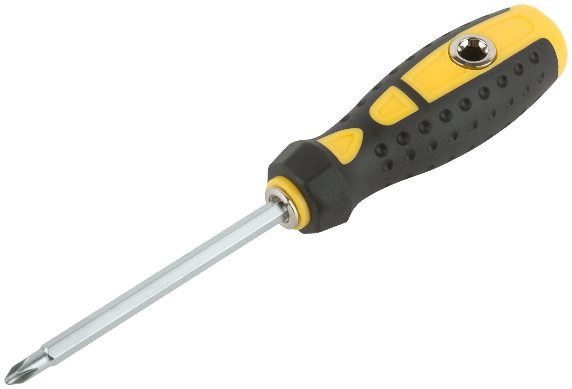 Отвертка с переставным жалом (CrV сталь, прорезиненная ручка, 6х130 мм, РН2/SL6) FIT IT Профи 56230 используется для монтажа/демонтажа резьбовых соединений. Дополнительное отверстие на ручке позволяет использовать инструмент в качестве Т-образной отвертки. Жало из хром-ванадиевой стали отличается высокой прочностью и долговечностью.