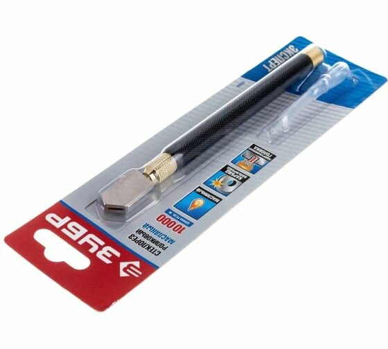 Стеклорез ЗУБР - оптимальный инструмент для точной и аккуратной резки стекла. Металлическая рукоятка и твердосплавный режущий элемент обеспечивают длительный срок службы инструмента. Использование масла облегчает процесс резки и увеличивает срок службы режущего элемента. Твердосплавный режущий элемент. Металическая ручка. Подпружиненная головка. Использование масла облегчает процесс резки и увеличивает срок службы режущего элемента. Пипетка для масла в комплекте. Твердосплавный режущий элемент. Подпружиненная головка.