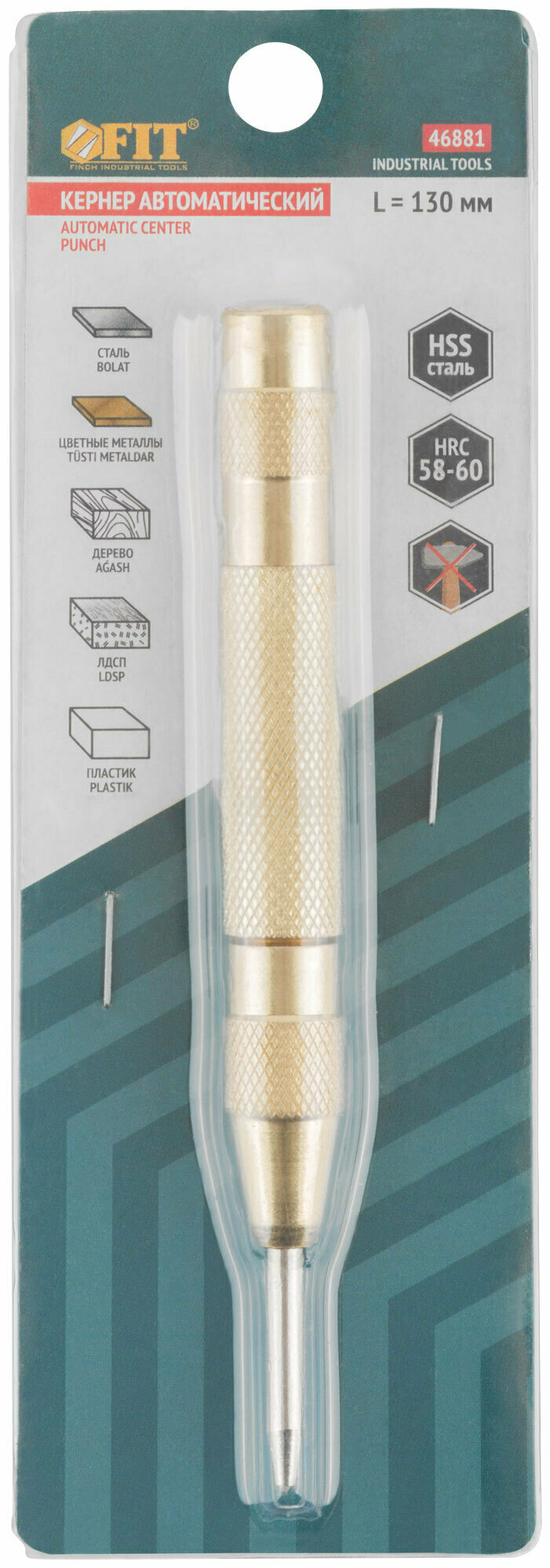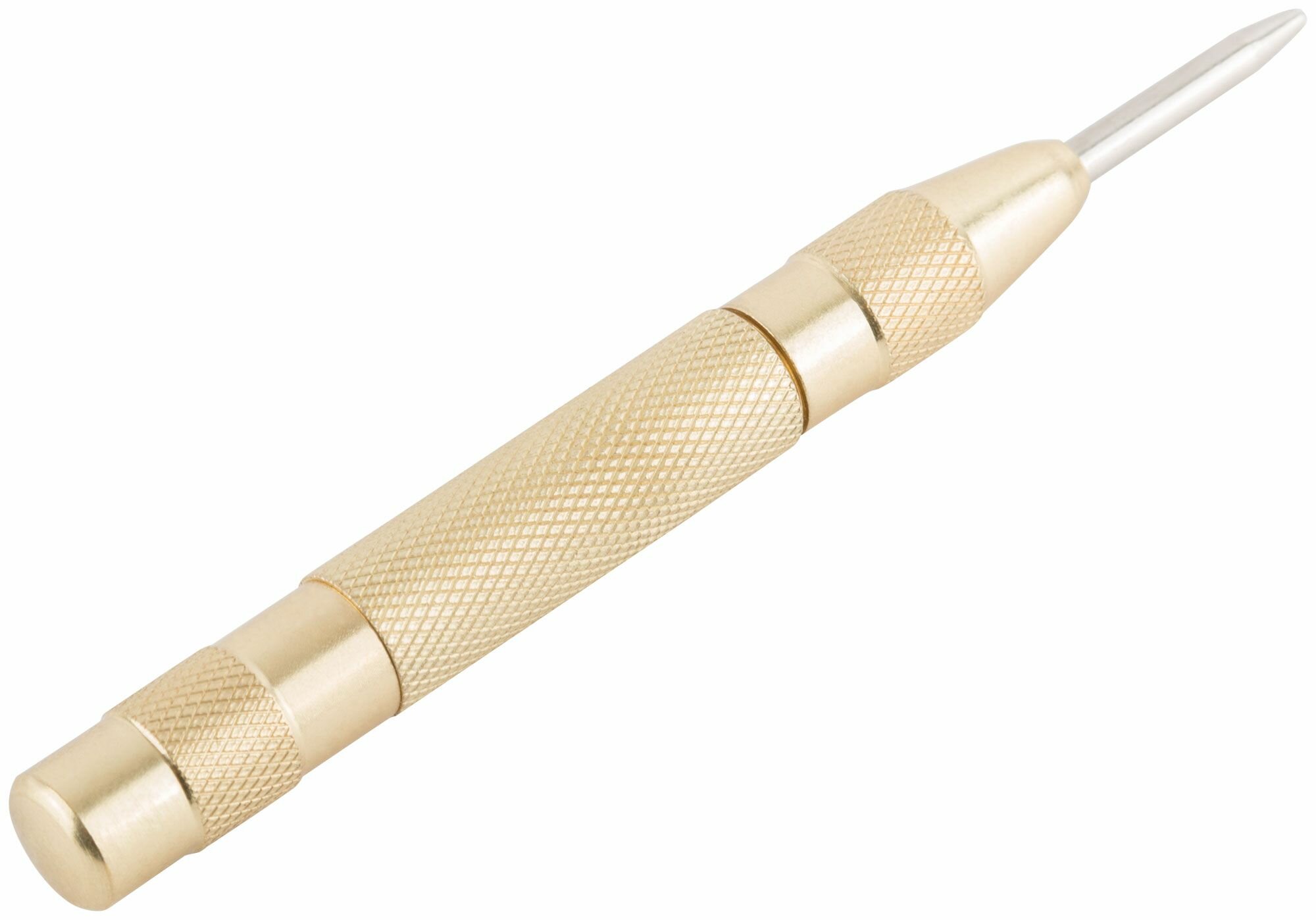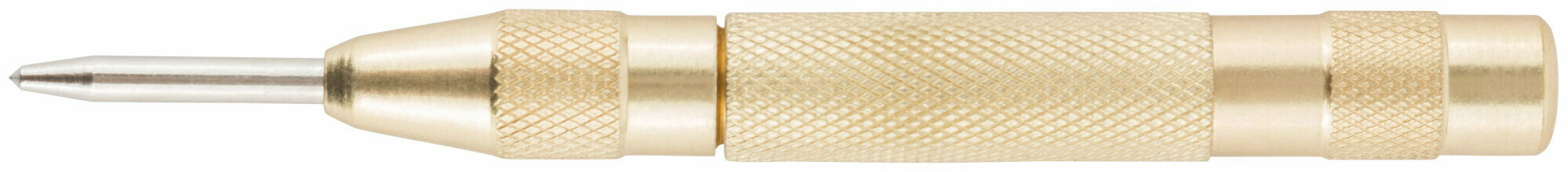 Для нанесения разметки и кернения незакаленной стали твердостью до 45 HRC, а также цветных металлов, пластика, дерева, ЛДСП и т.п. материалов. Благодаря пружинному механизму не требует применения молотка и может использоваться одной рукой. Удобен для работы в труднодоступных местах. Сила удара регулируется поворотом колпачка в верхней части кернера. Твердость наконечника 58-60 HRC. Материал: корпус из инструментальной стали с латунным покрытием, наконечник из быстрорежущей (HSS) стали с антикоррозийным никелевым покрытием.