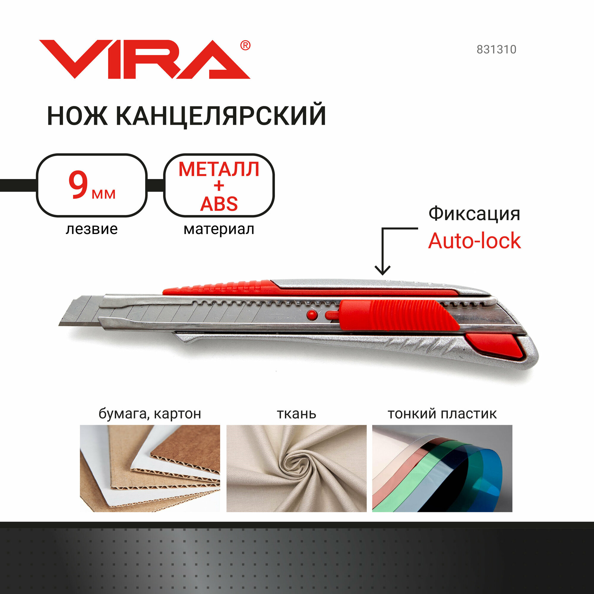 Сегментированный нож VIRA металлический корпус, 9 мм 831310 предназначен для канцелярских целей. Имеет прочное лезвие из быстрорежущей стали. Подойдет для профессиональной и бытовой эксплуатации.
