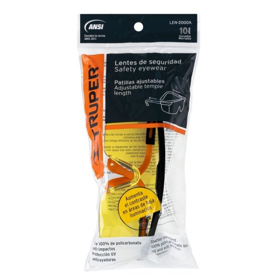 Защитные очки TRUPER универсальны в применении. Обеспечивают защиту от мелких летящих частиц, пыли, УФ-излучения. Это незаменимый аксессуар для защиты глаз от механических повреждений, а также от вредного воздействия различных излучений и химических веществ. Изготовлены из высококачественных материалов, обеспечивающих прочность и долговечность.Преимущества Имеют регулируемые дужки для комфортной посадки Линзы поликарбонат с покрытием от царапин, защищают от ультрафиолета Соответствуют сертификату безопасности ANSI Z87.1 В дужках присутствуют специальные отверстия для шнурка