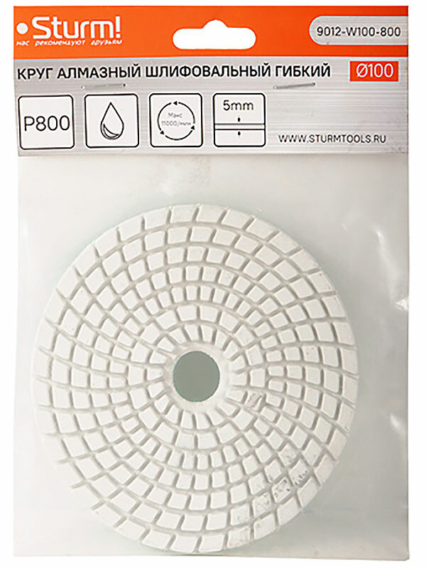 Круг алмазный гибкий шлифовальный АГШК (100 мм, P800, мокрая шлифовка) Sturm 9012-W100-800 предназначен для полировальных и шлифовальных машин. Применяется для мокрой полировки гранита, мрамора, керамогранита. Высокое качество связки и синтетического алмазного порошка гарантирует длительное использование, а также постепенное равномерное снятие слоя шлифуемого материала, а на выходе ровную поверхность без царапин.