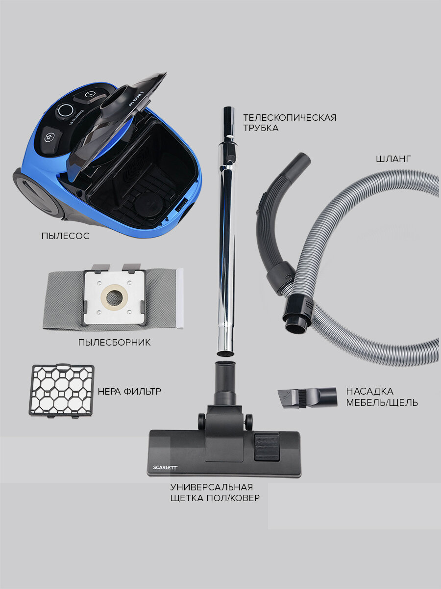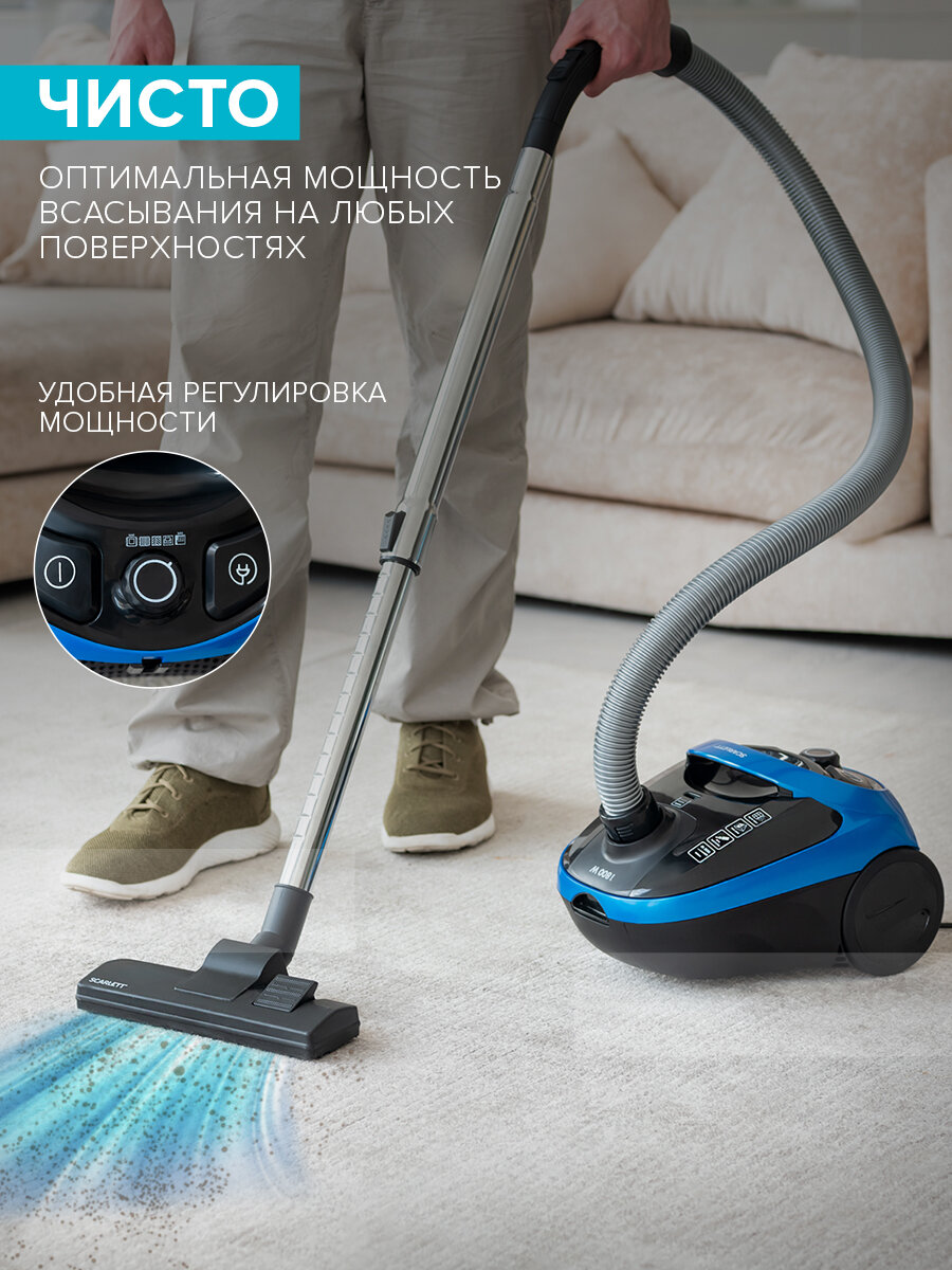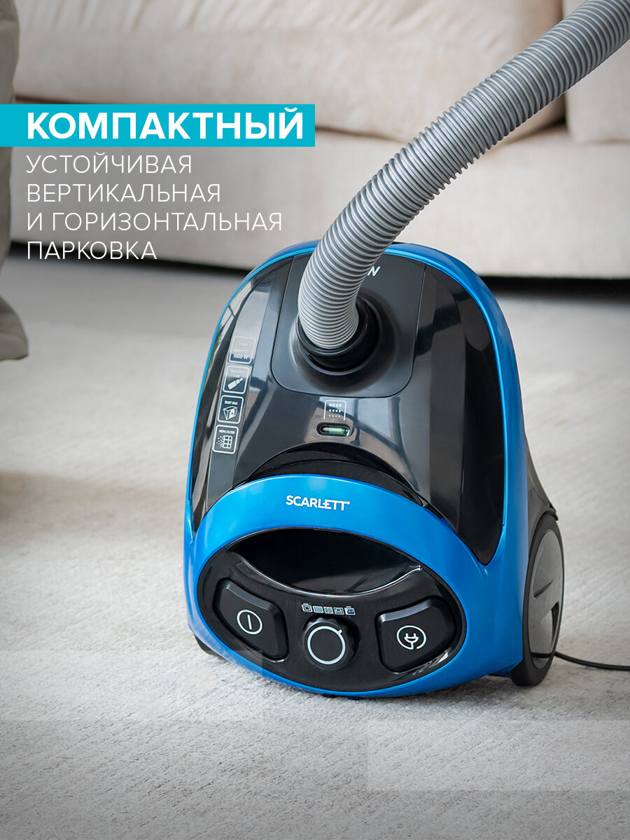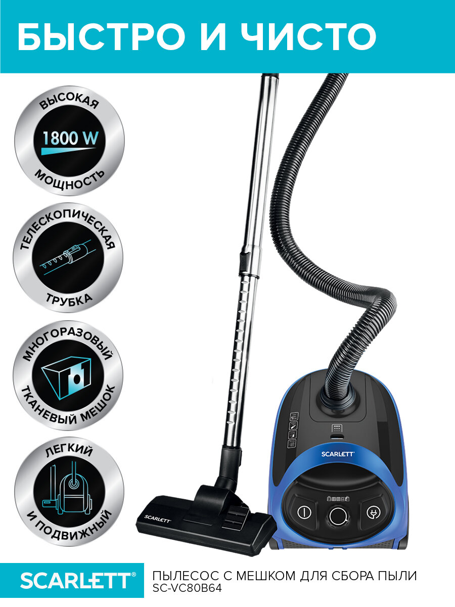 Пылесос Scarlett SC-VC80B64 синий, мощность 1800Вт, уборка: сухая, объем пылесборника 2л, мощность всасывания 350Вт, регулировка мощности на корпусе, длина шнура 5м