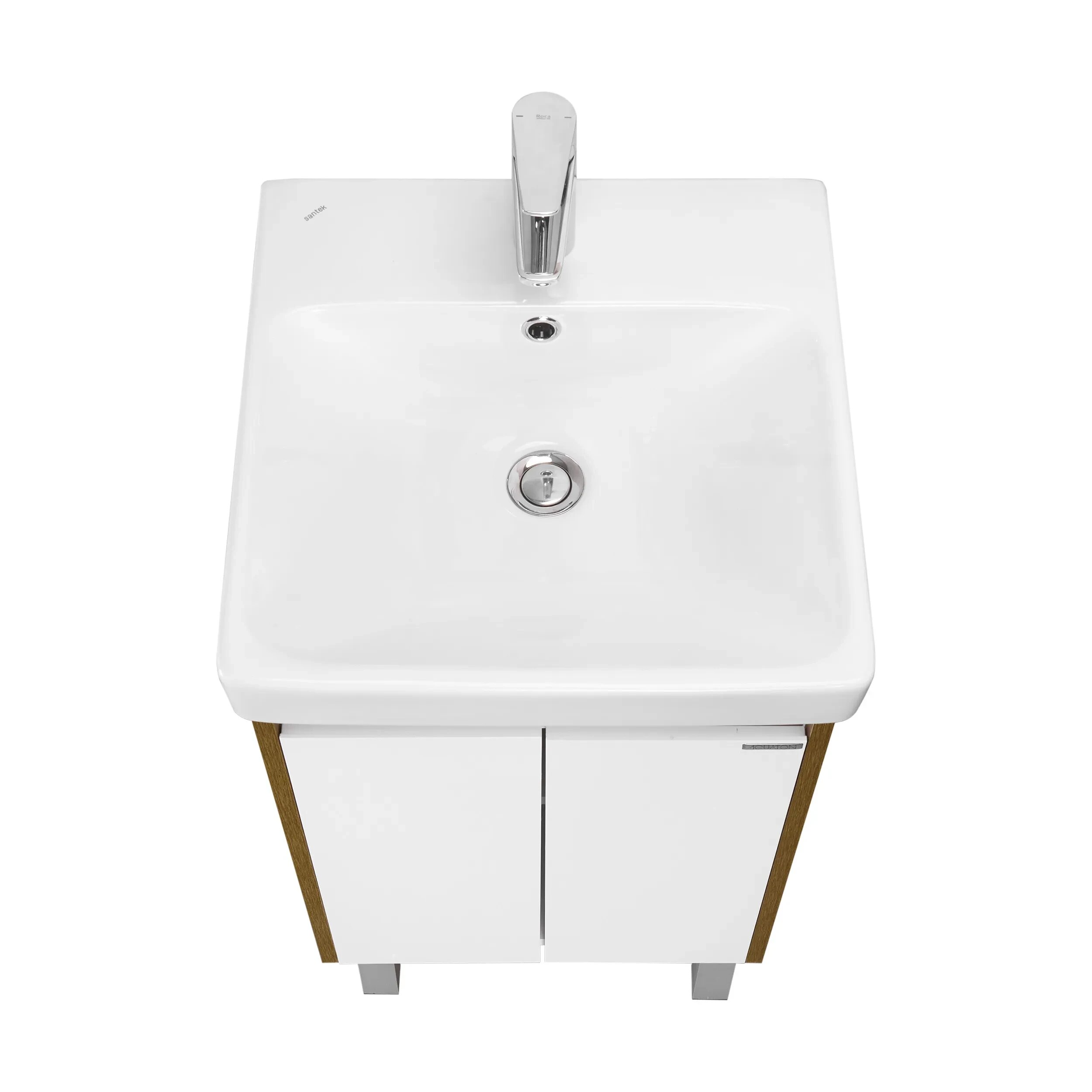 Тумба Сканди Doors 45 выполнена в популярном минималистичном скандинавском стиле. Корпус выполнен из влагостойкой ЛДСП в декоре натурального дерева, а фасады-створки в белой глянцевой покраске, гарантирующей защиту мебели от воздействия влаги в условиях ванной комнаты. За створками скрывается вместительное пространство, разделенное на две части регулируемой по высоте полкой из ВЛДСП. На тумбе нет выступающих деталей и фурнитуры, открытие створок реализуется за фасад, верхняя часть которого обработана под ручку J-профиль. К тумбе идеально подходит белоснежная раковина Адриана от бренда Santek (приобретается отдельно). Во избежание ухудшения эксплуатационных свойств изделия при необходимости в достаточной степени проветривайте помещение. Не рекомендуется устанавливать изделие ближе 1 метра от отопительных приборов, радиаторов водяного отопления, неизолированных труб и т.д.