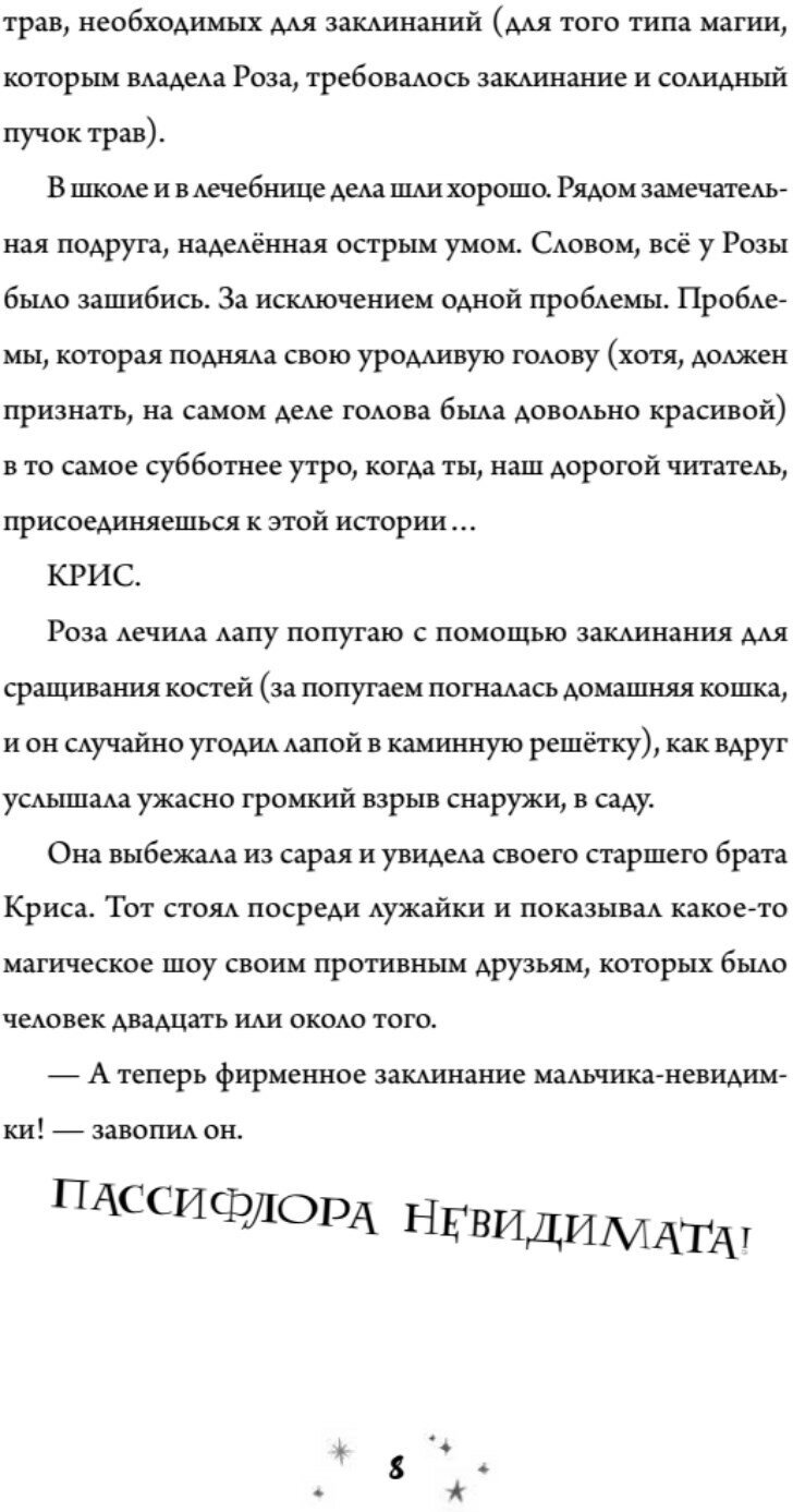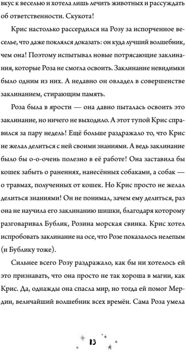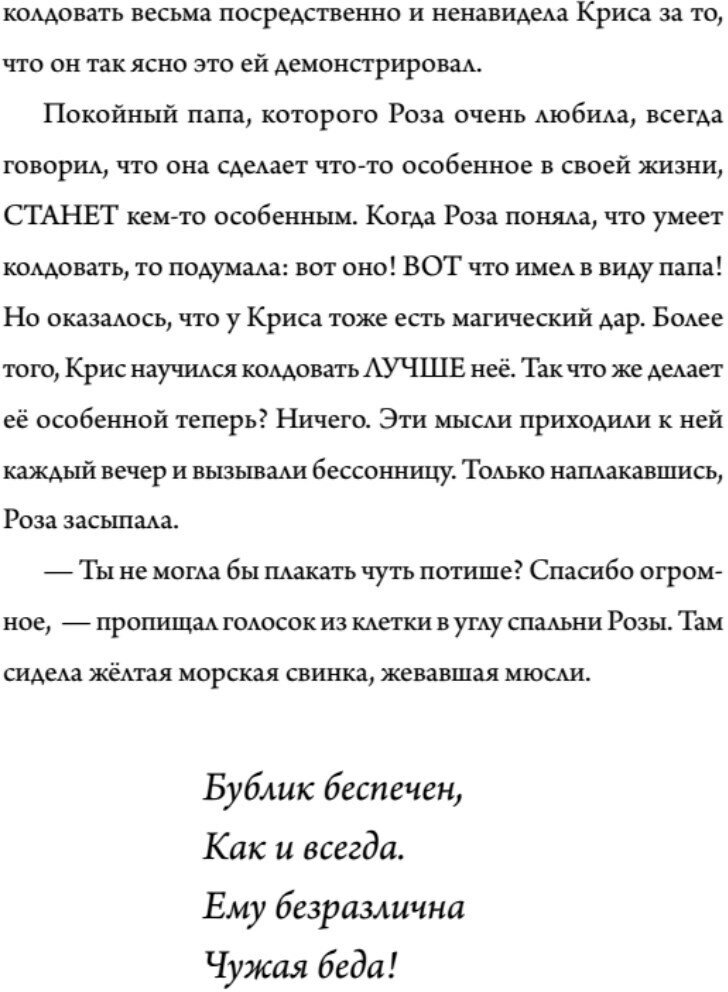 Мне нравится, как пишут сейчас детские книги на новый лад. Не стесняясь слов и эмоций, задорно, как бы выпрыгивая за границы, пишут на полях, пишут капсом, динамично расставляя акценты в тексте. Новое поколение уже другое и в книжках появляются забавные моменты психологии: "кролика травмировал вид моркови". Эта книга является продолжением "Роза Фалви и волшебник в саду", хотя сама по себе довольно самостоятельная и нет необходимости знать первую книгу, поскольку автор даже слегка вводит Вас в курс дело. Другой вопрос - это то, что Вам самим захочется прочитать ее, если еще не читали, чтобы еще хоть немного урвать этого волшебства и нестандартного слога. Получится как приквел. Однако вечный раздор брата и сестры, в общем то, и не волшебная история, а очень даже обыкновенная, два этих героя - два задиристых волшебника и будут в центре событий этой книги и после, по традиционным канонам, раскроют свою сильную родственную любовь. А Бублик, теперь говорящая морская свинка, напомнит нам всем, какое же это волшебство - ИМЕТЬ ГОЛОС! Возраст аудитории и вовсе не ограничен, все родители, которым придется прочитать эту книгу со своими детьми, насмеются вдоволь. Не буду раскрывать все подробности, просто знайте, что дальше Вас опять ждут чудеса и приключения, приправленные задорным повествованием автора, от которого смеются и малолетки, и взрослые.