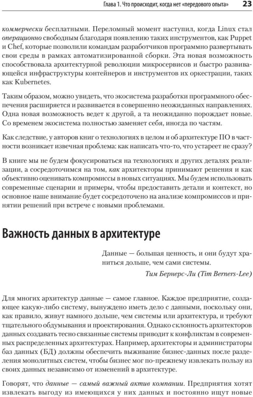 В архитектуре программного обеспечения нет простых решений. Напротив, есть масса сложностей - задач и проблем, для решения которых нет готовых ответов и приходится выбирать между различными компромиссами. Эта книга научит вас критически относиться к компромиссам, связанным с распределенными архитектурами.