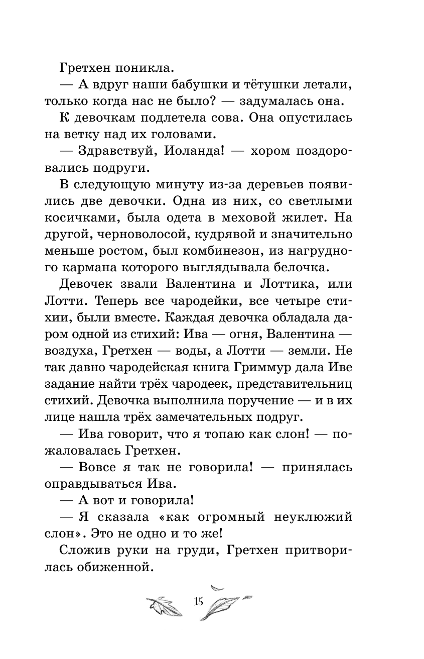 Ива, Валентина, Лотти и Гретхен в опасности! В магический лес пробрались незнакомцы. Это значит, что они могут запросто найти волшебный домик и книгу заклинаний. И раскрыть тайну чародеек… К тому же, Валентина переезжает! Только вот без неё у подруг не останется стихии воздуха, и их магия ослабнет… Смогут ли чародейки сохранить силу четырёх стихий? И защитить тайну волшебного леса от непрошеных гостей?