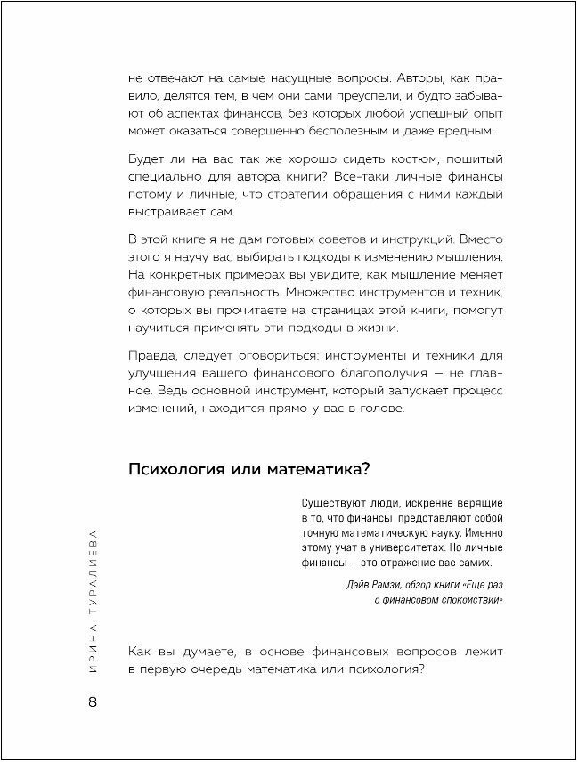 Почему одни живут от зарплаты до зарплаты, а другие – на проценты от процентов? Кажется, что между двумя этими состояниями пропасть. На самом же деле улучшить финансовое положение можно, если изменить способ мышления. Ирина Туралиева, финансовый аналитик с многолетним стажем, предлагает инструменты и техники, которые помогут: