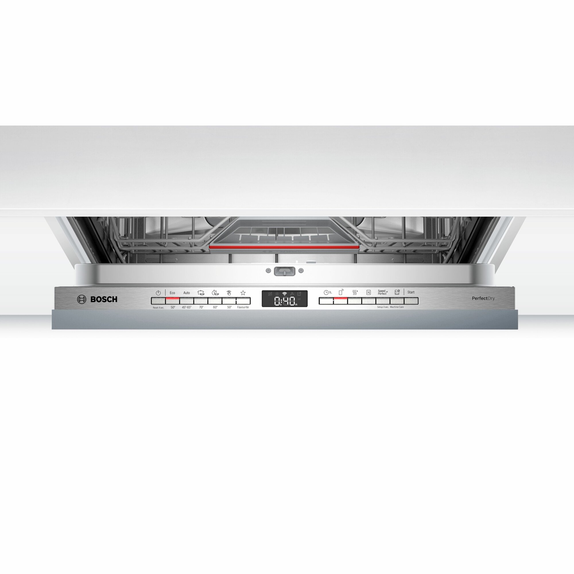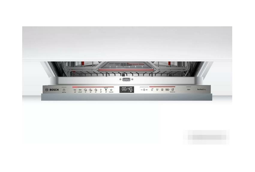Встраиваемая посудомоечная машина Bosch вмещает до 14 комплектов посуды и подходит для больших семей. Модель имеет три корзины, включая переставляемый по высоте верхний короб с системой Rackmatic. Это позволяет оптимизировать внутреннее пространство под посуду любого размера.