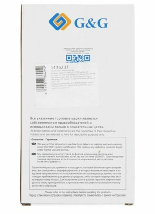 Картридж G&G является совместимым и представляет собой практичную альтернативу штатному картриджу, позволяя экономить средства на обслуживании печатной техники. Изделие соответствует требованиям печатающих устройств, поэтому гарантирует бесперебойную работу на протяжении всего эксплуатационного ресурса.