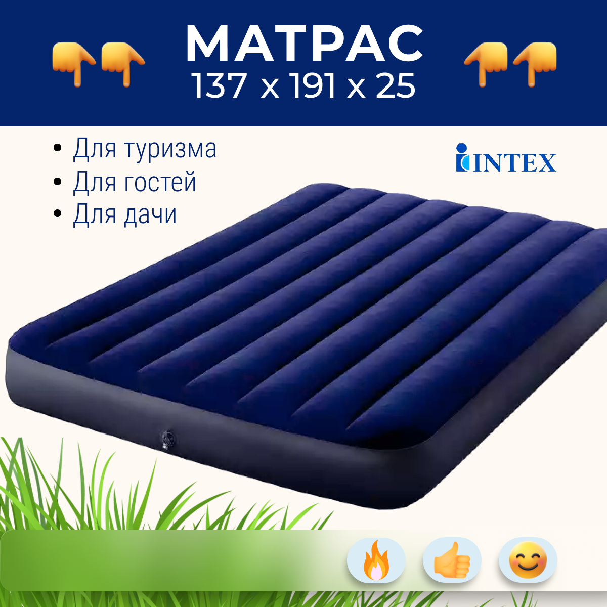 Размеры: 137x191x22 см. Цвет: тёмно-синий. Надувной матрас Intex имеет привлекательный тёмно-синий цвет. Особенность матраса - наилучшее соотношение цена-качество. При минимальной стоимости изделия Вы получаете комфортную дополнительную кровать для дома и прочный матрац для туризма. Флокированное(велюровое) покрытие,нанесённое на поверхность кровати, не позволит скользить простыне. Внутреннее устройство матраса представляет собой оболочку с перегородками для плавного перетекания воздуха.