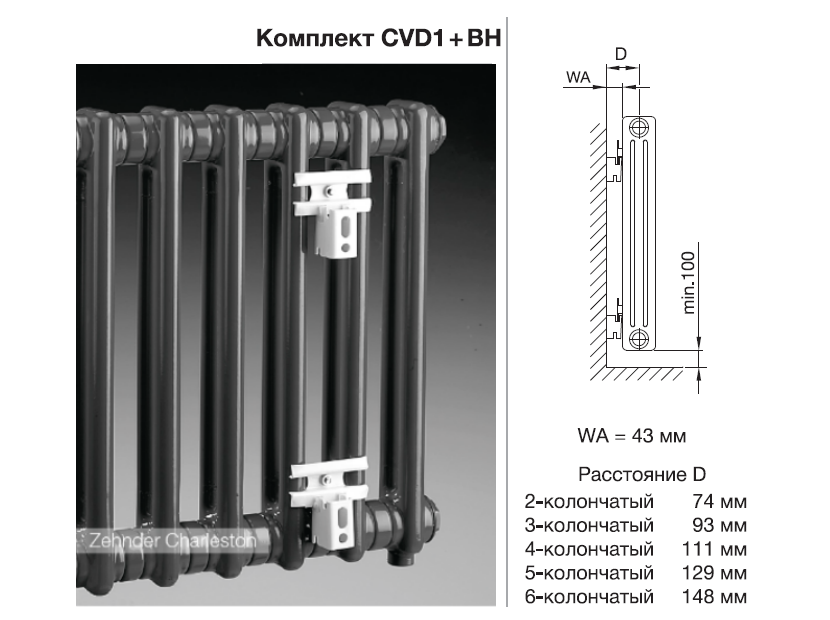 Радиатор стальной Zehnder Charleston 3180/10 3-трубчатый подключение V001 белый с кронштейнами 3180_10_9016_V001_CVD1BH (размер: 486x1806)