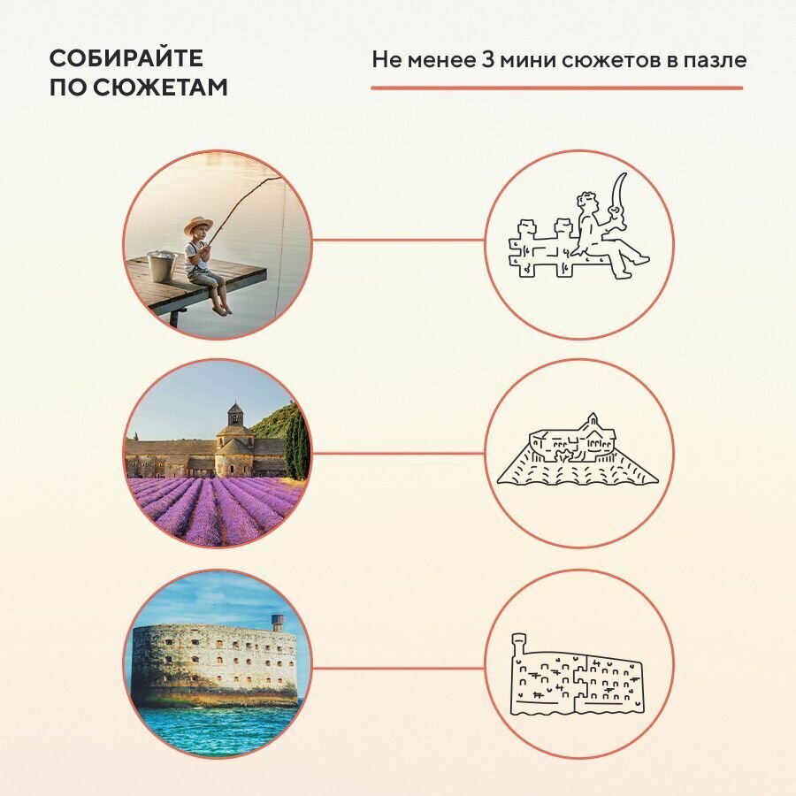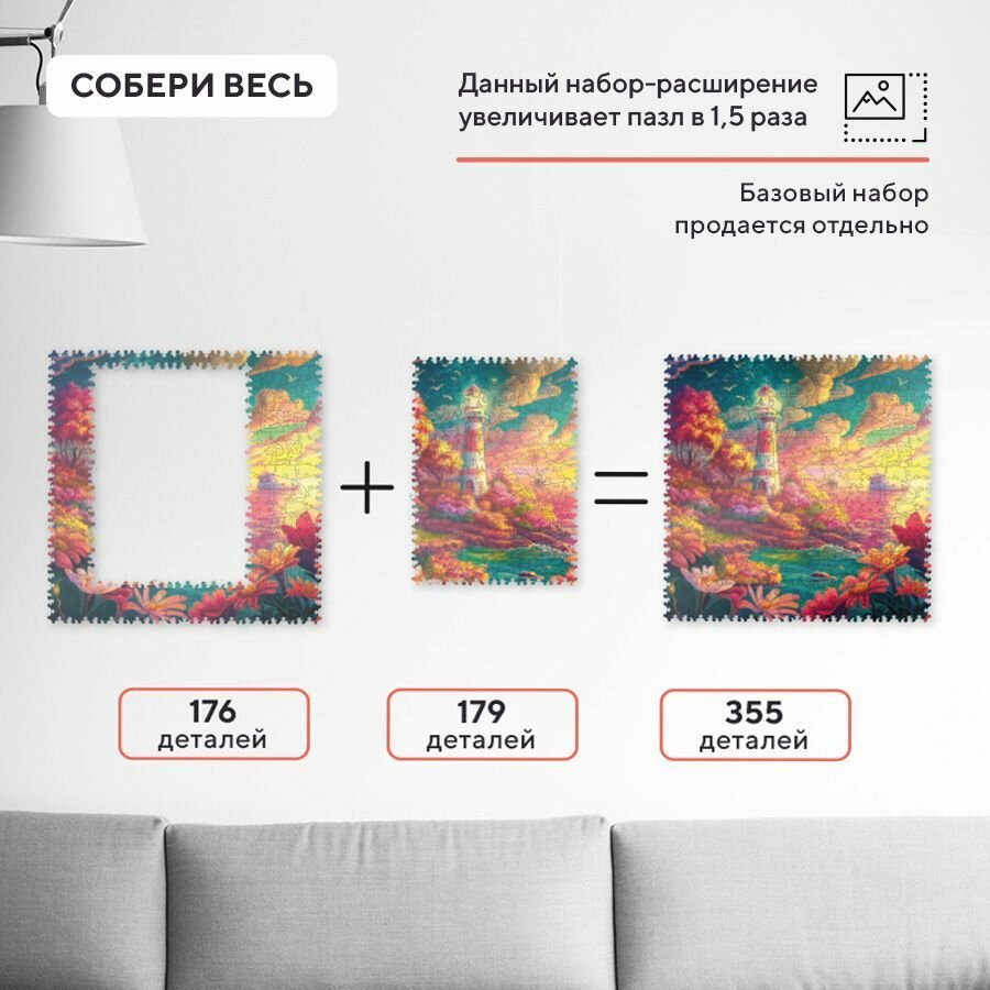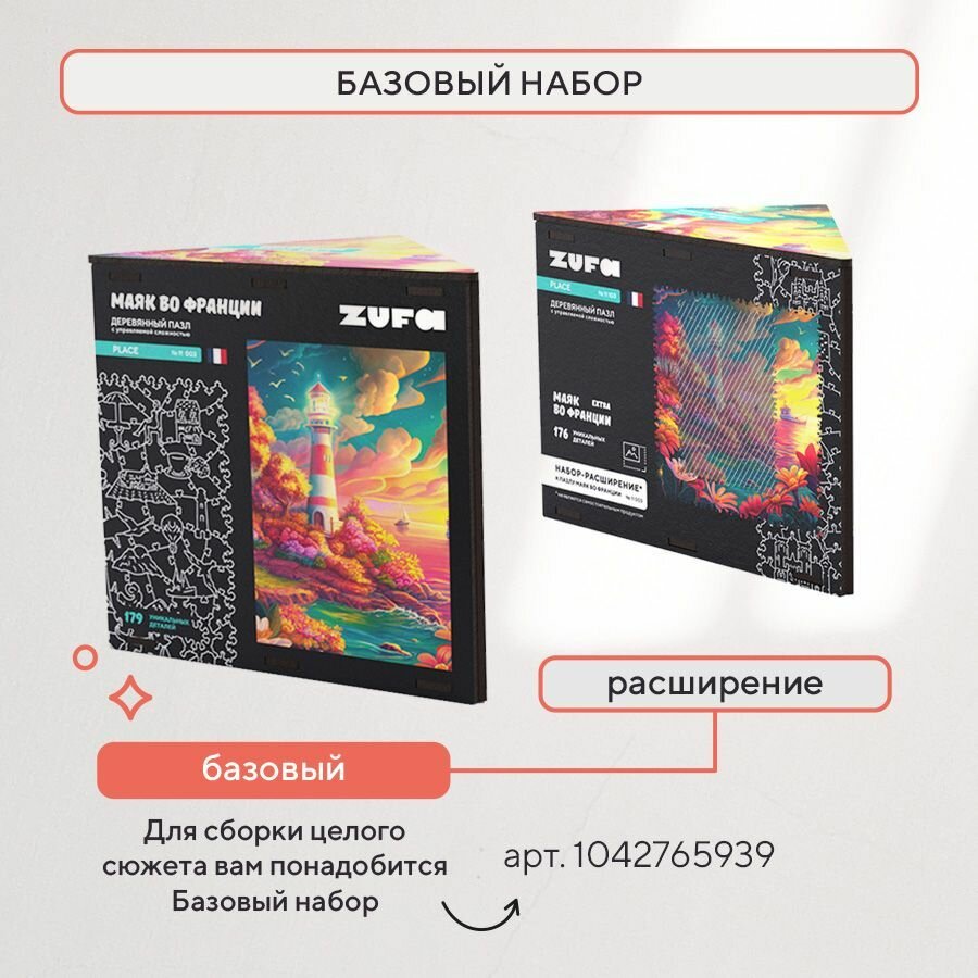 В наборе основной пазл (179 деталей), и дополнение (176 деталей). Дополнение увеличивает базовый сюжет пазла "Маяк во Франции" (№ 11003) на 176 детали, позволяя расширить иллюстрацию в 1,5 раза.